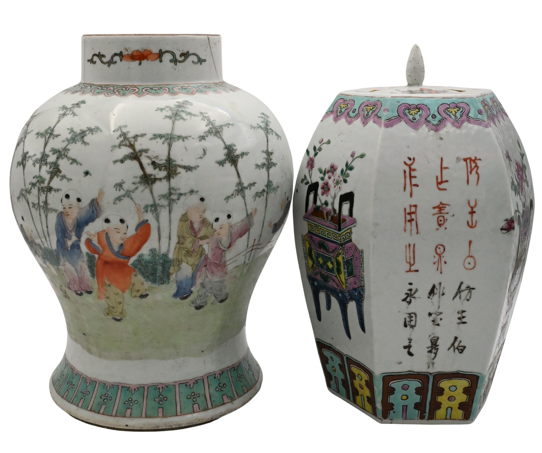 Republic style, one hexagonal covered jar painted with alternating panels of floral sprays, auspicious vases, and calligraphy, together with a baluster jar decorated in famille rose enamels with a continuous scene of children at play in a garden, with turquoise borders at foot and shoulder.