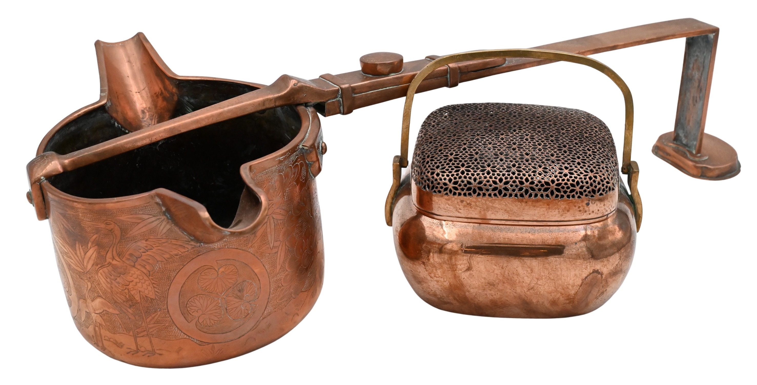 Comprising a Buddhist ritual vessel with long engraved handle, together with a copper brazier having a pierced cover and swing handle.