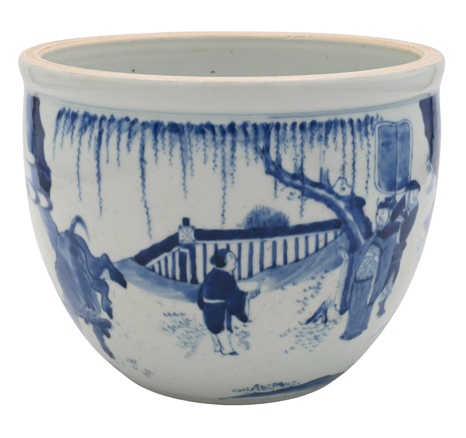 decorated in underglaze cobalt blue with a continuous scene of officials and attendants in a garden landscape beneath willow trees, the rim with dripping blue border, Christies Hong Kong 2007 label