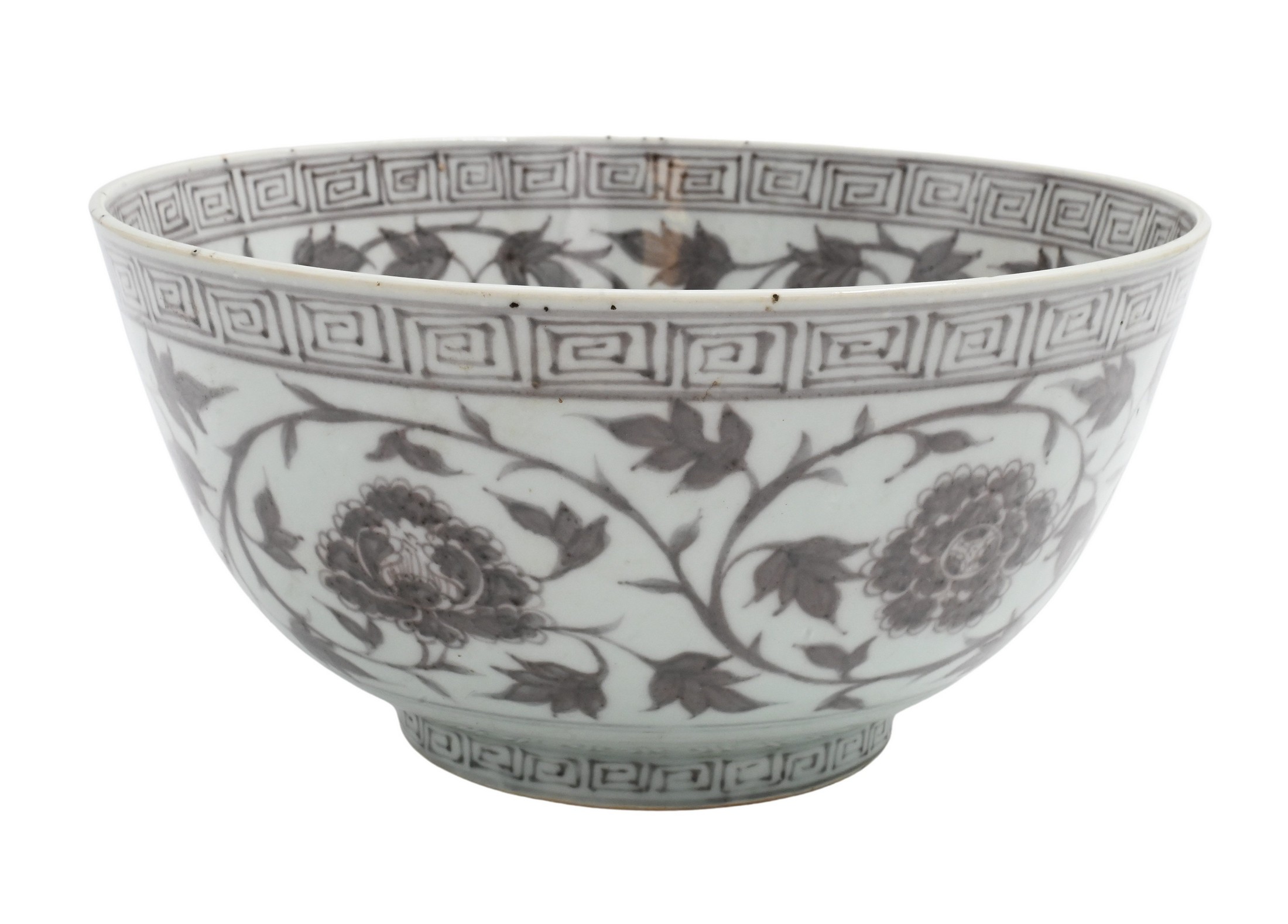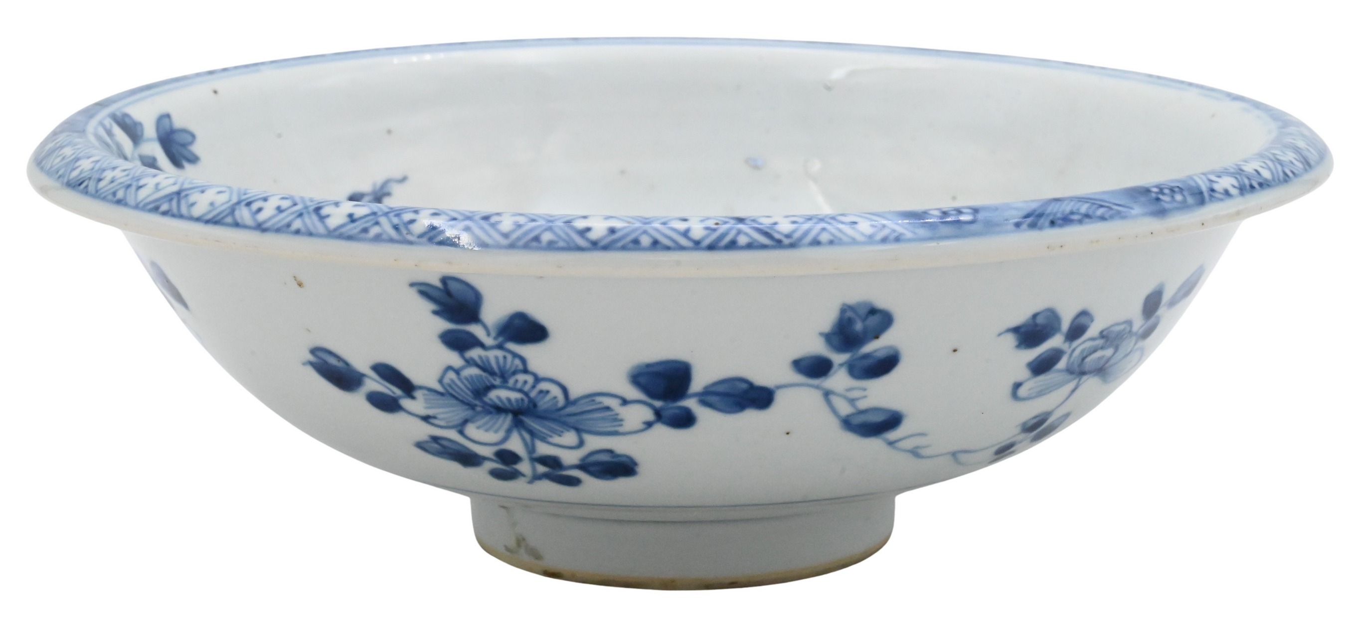 deep porcelain bowl, the interior decorated with a pine tree and peony floral scene within a diaper border, the exterior with floral sprays and double circle at base. With dealer’s label to underside