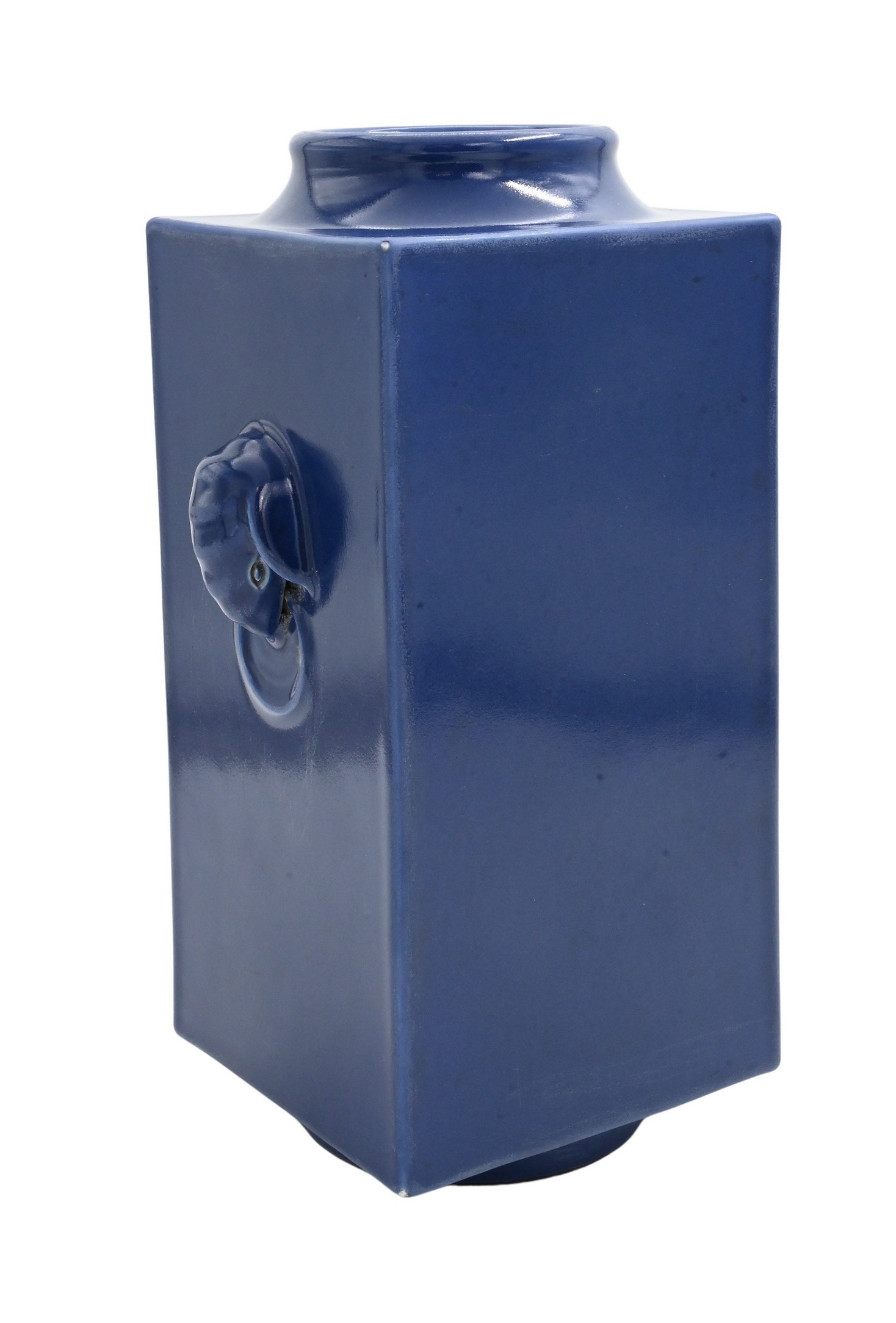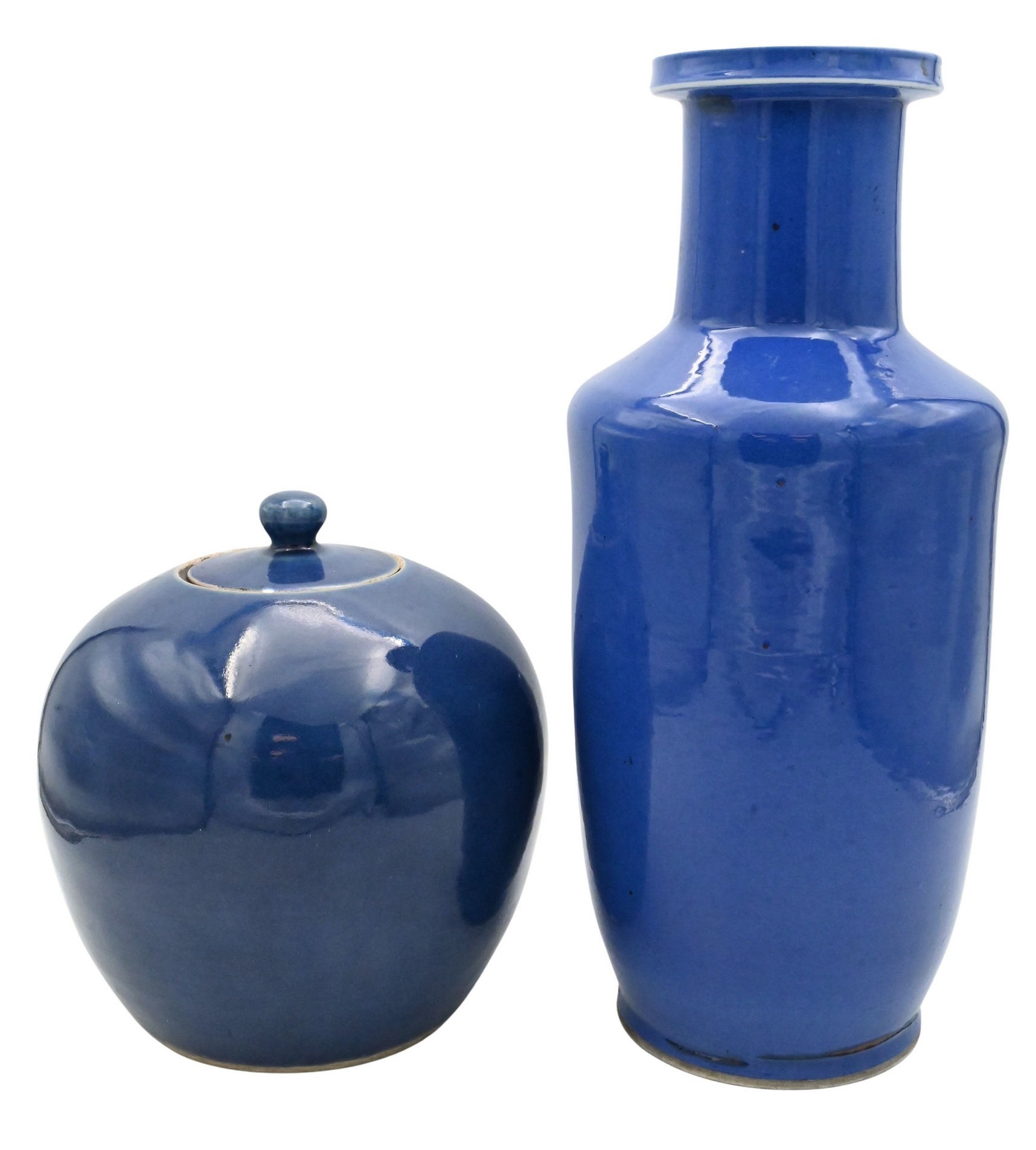 each covered overall in a rich, blue glaze, one tall rouleau vase bearing a double circle mark in underglaze blue beneath the base along with ovoid covered jar