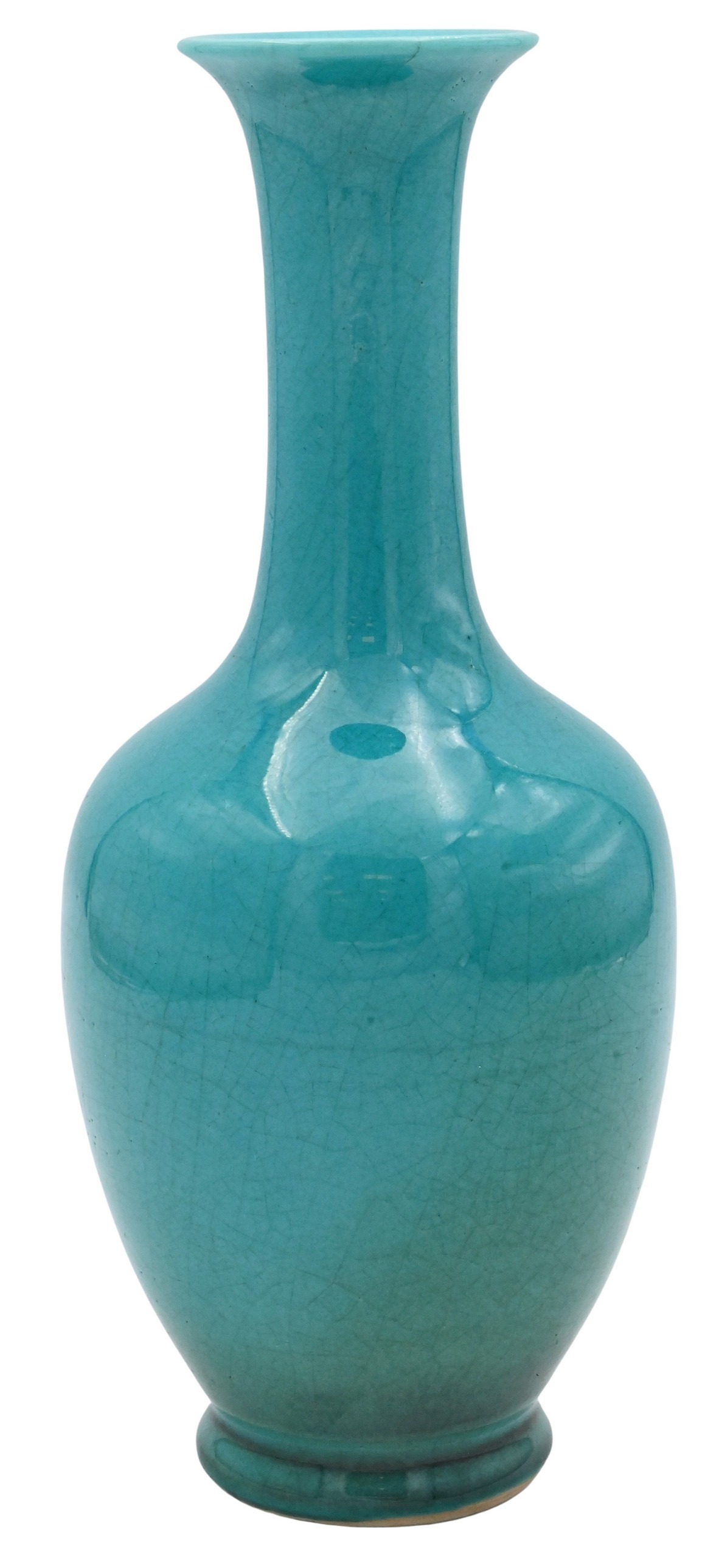 having slender neck over bulbous body, covered overall in a bright turquoise glaze with fine craquelure. Base with a six-character Qianlong mark in underglaze blue