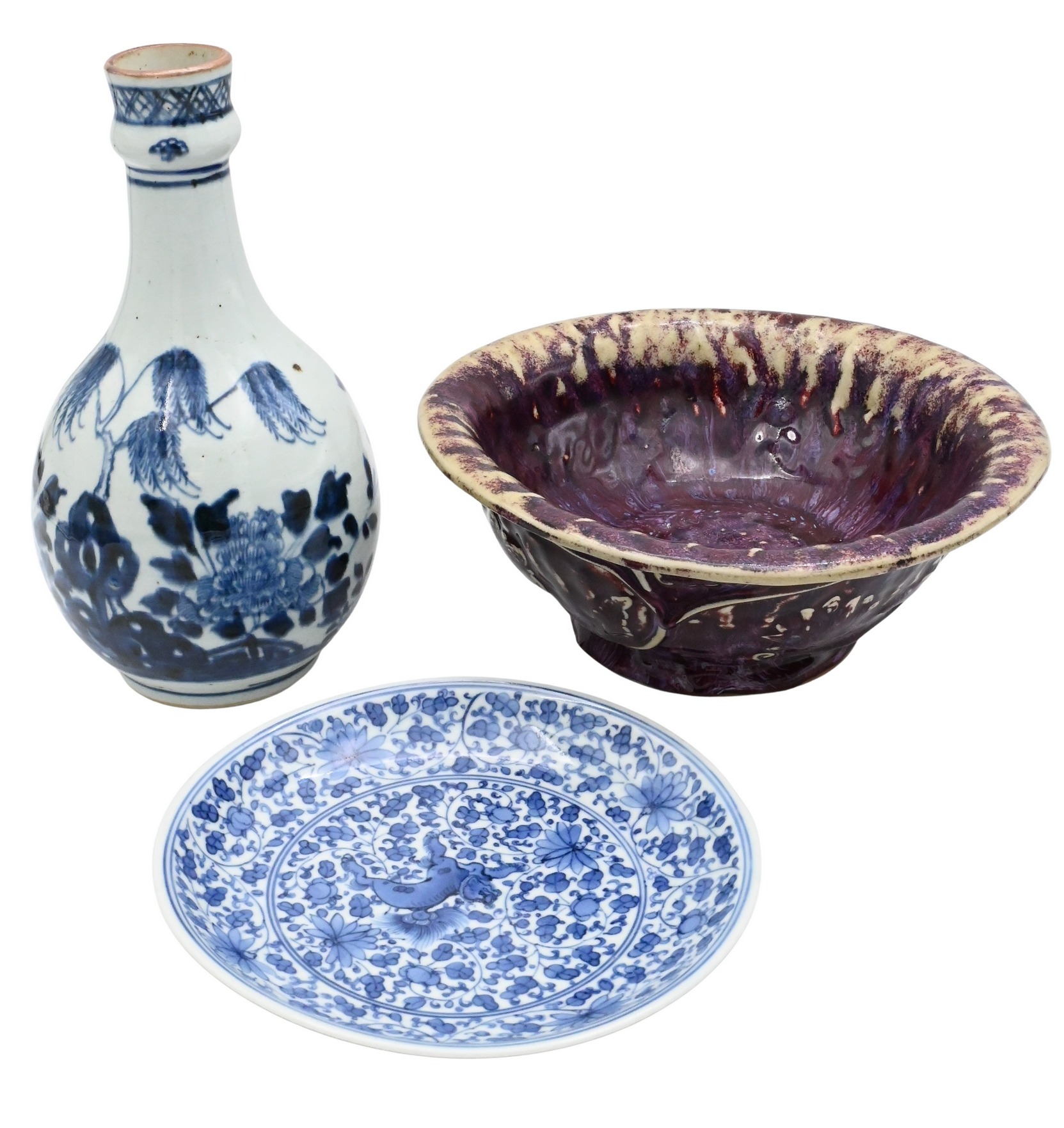 A Chinese red-glazed porcelain bowl with mottled purple-red glaze pooling to cream at the rim and base. Diameter 9 1/4 inches, a Chinese blue and white porcelain bottle vase, painted in underglaze blue with phoenix and peony motifs above a lappet border, with banded decoration at the neck. Height 9 inches along with a Chinese blue and white porcelain dish decorated with dense floral scrollwork within double-line borders. Diameter 7 inches