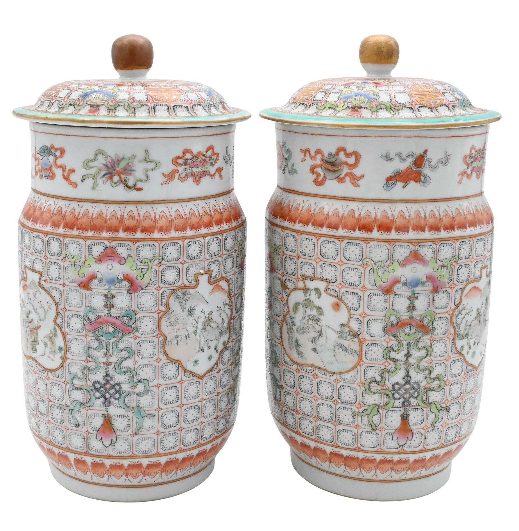 Republic Period, cylindrical porcelain jars with domed covers and gilt finials, each decorated in famille rose enamels with repeating diaper grounds inset with figural landscape cartouches, interspersed with auspicious objects, bats and ribboned emblems.