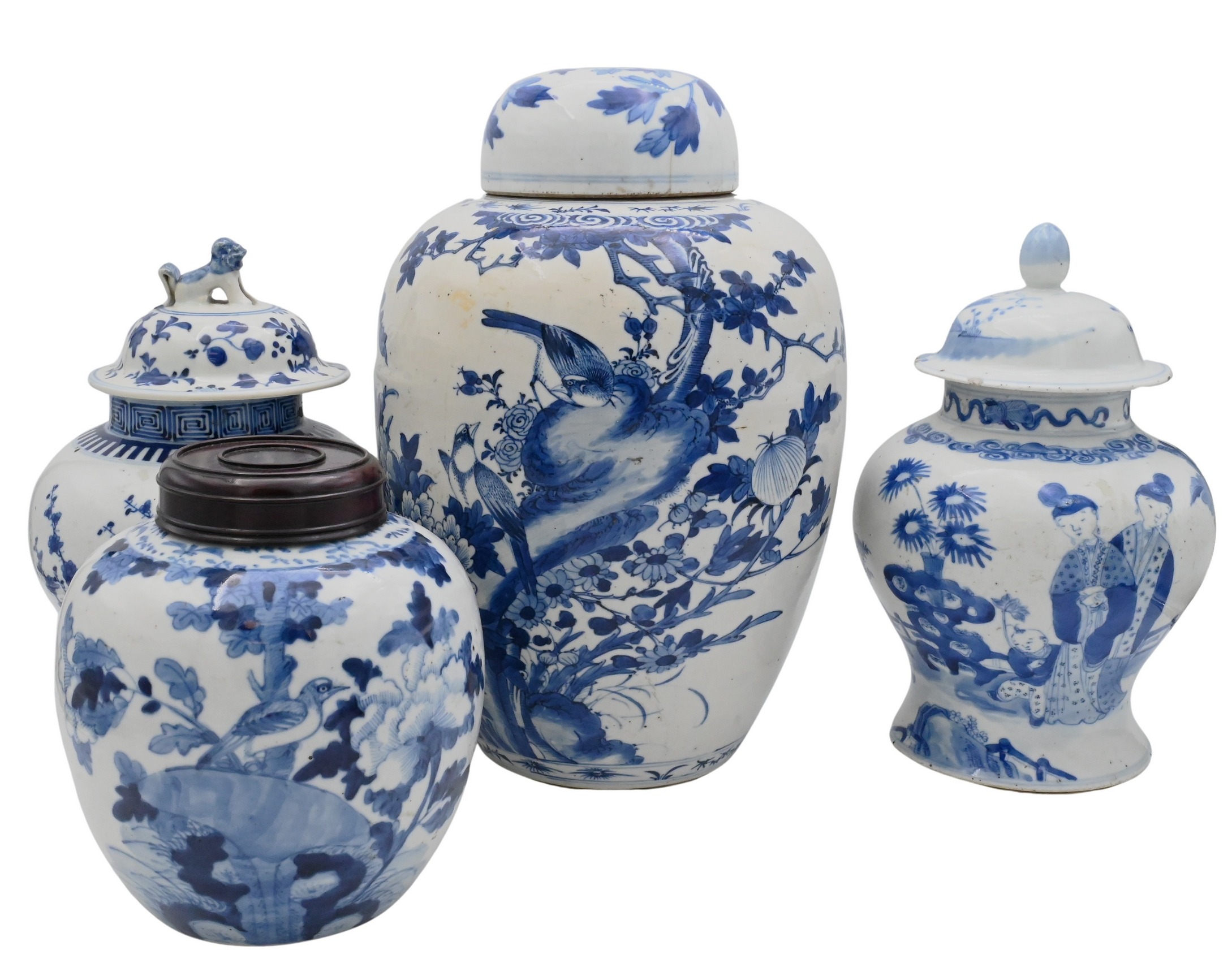 Group of Four Chinese Blue and White Porcelain Covered Jars