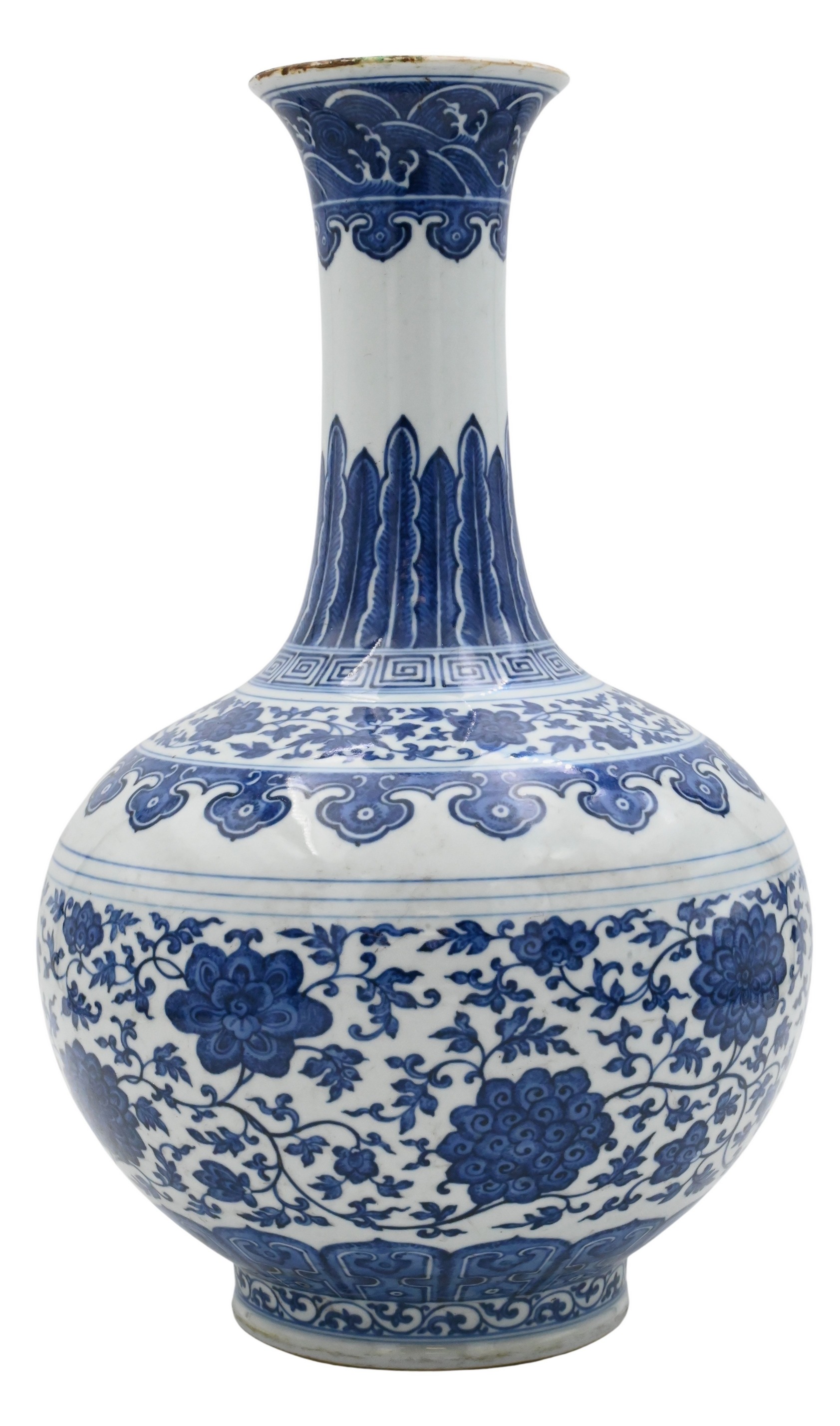 A large Chinese porcelain vase with elongated neck and bulbous body, decorated in underglaze blue with lotus scrolls and foliate bands, the shoulder with lappet border and the neck with ruyi-head designs. Underside with underglaze blue reign mark. Drilled through the base, having been previously mounted as a lamp.
