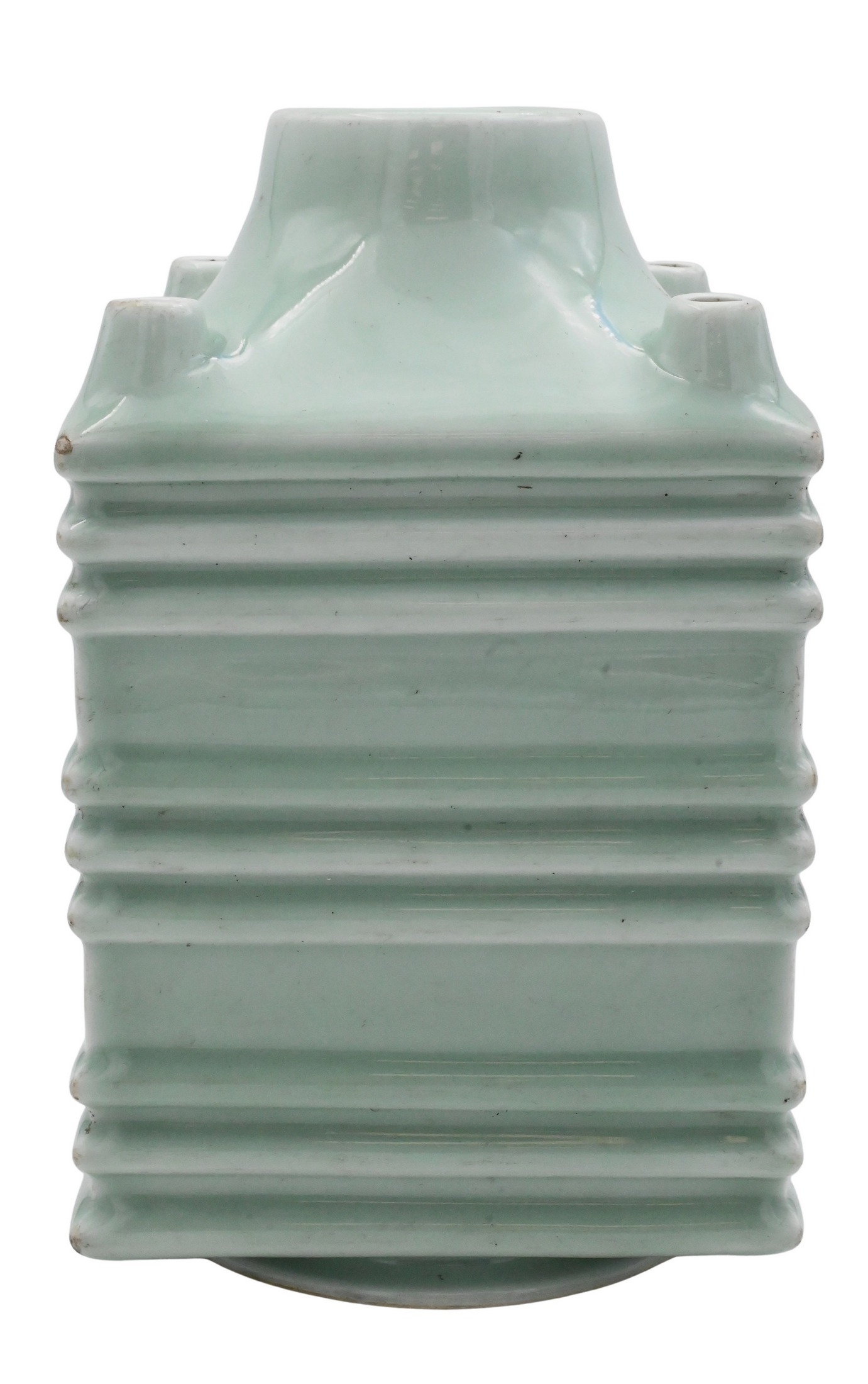 of square cong form, raised on a spreading circular foot and the sides are molded with three bands of horizontal ribs. Rising from the shoulder, four tubular corner necks frame a taller central neck. The body covered in a soft bluish-green glaze, the color pooling to a deeper tone in the recessed areas.