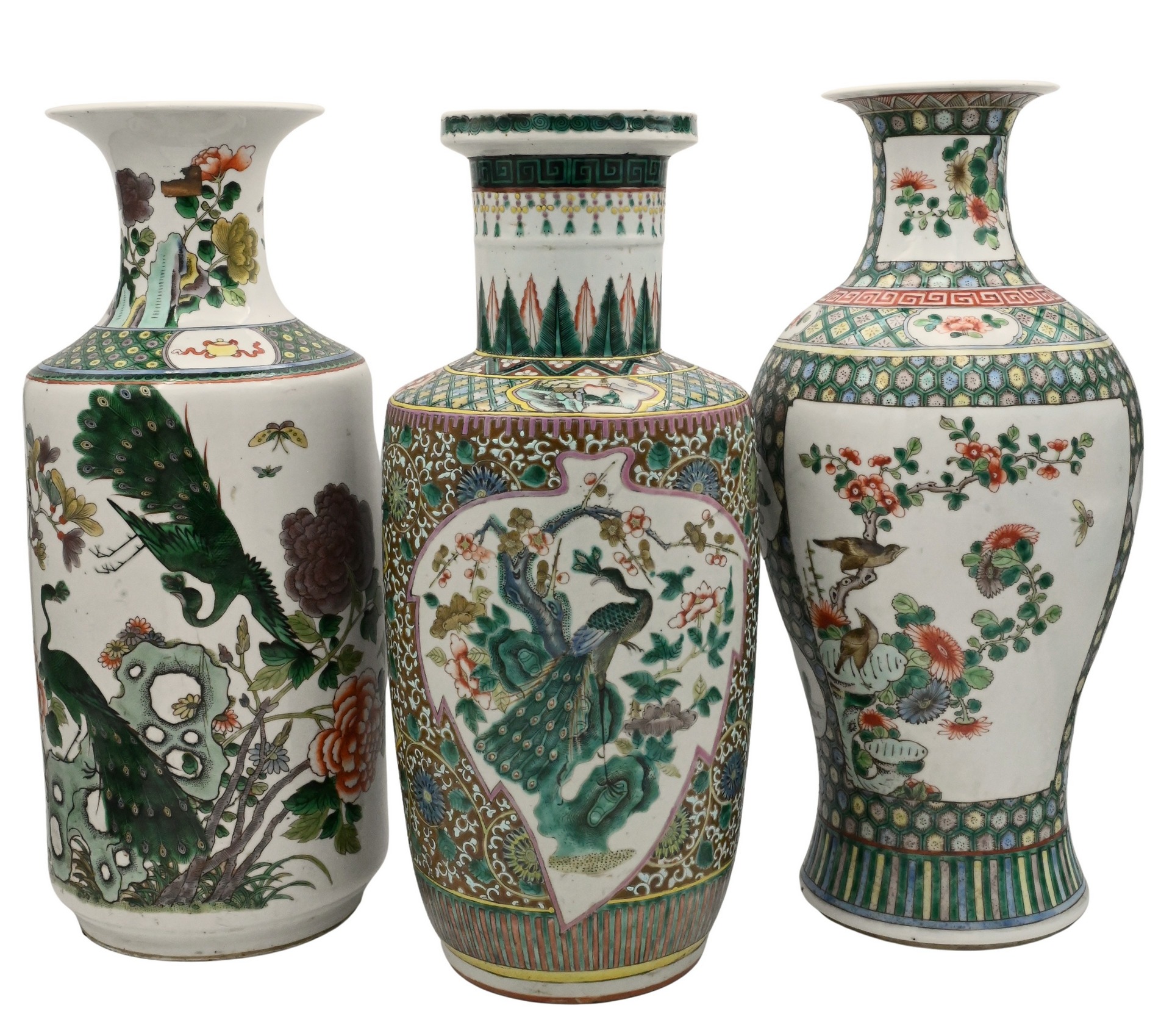 to include one baluster-form with panels of birds and flowers within hexagonal diaper borders; one tall vase decorated with a pair of peacocks among blossoming branches; and one rouleau-form vase with shaped panels of peacocks reserved on a dense diaper-pattern ground.