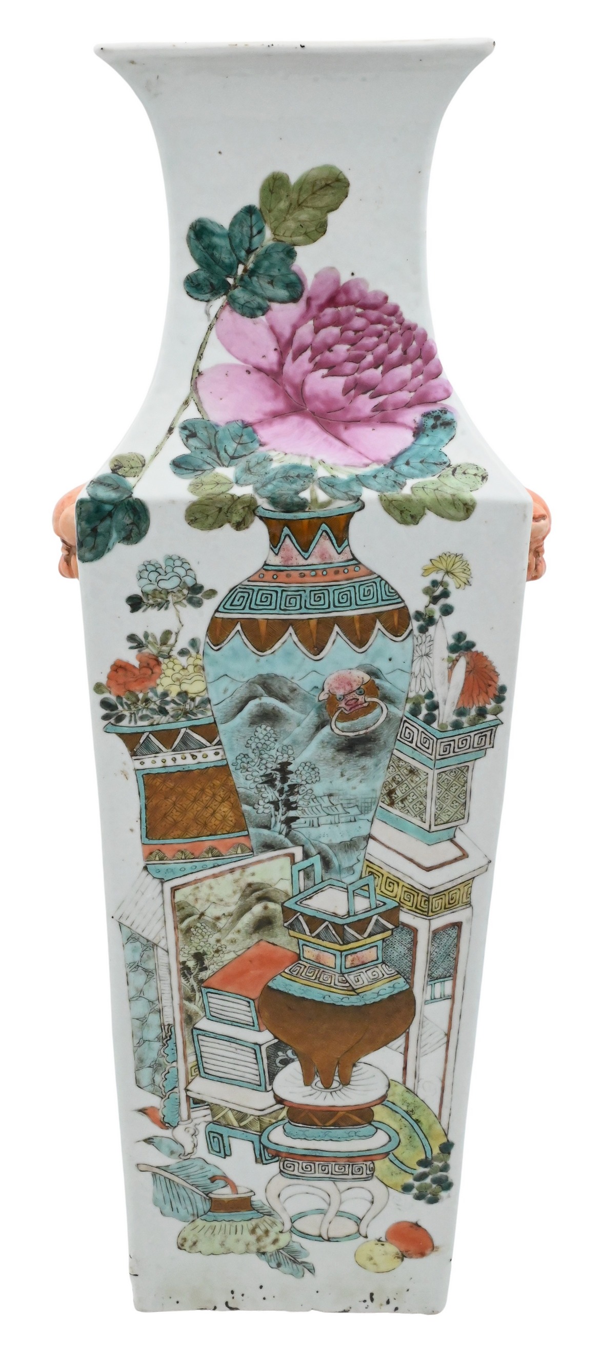 Of square form with flaring rim and lion mask handles, decorated in famille rose enamels with peonies, scholar’s objects, and auspicious motifs. Calligraphic inscriptions appear on two sides in iron red and black script.