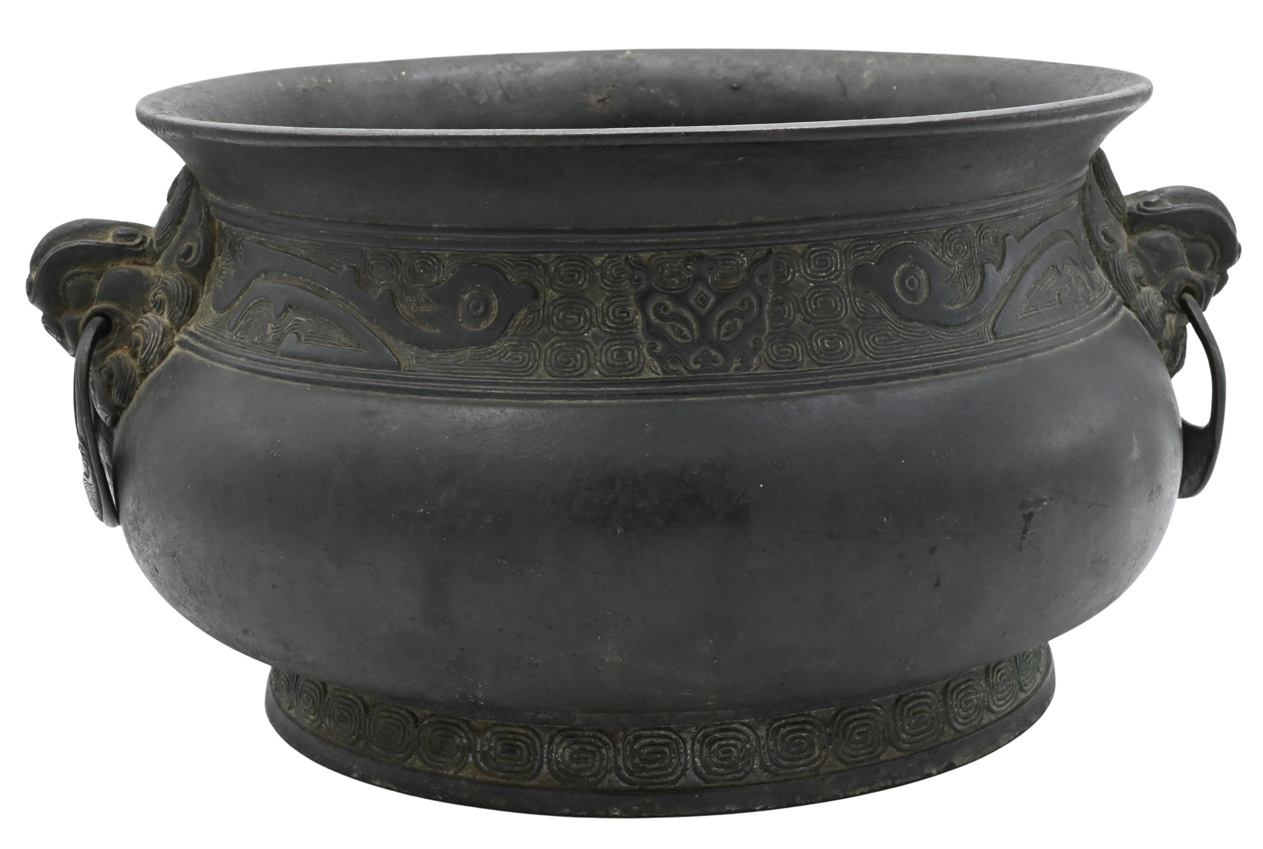 A Chinese bronze censer of bulbous form with everted rim, decorated in relief with archaistic taotie and geometric motifs, and applied with mask-and-ring handles. Dark patina throughout. Bearing a Ming Dynasty mark on the base.