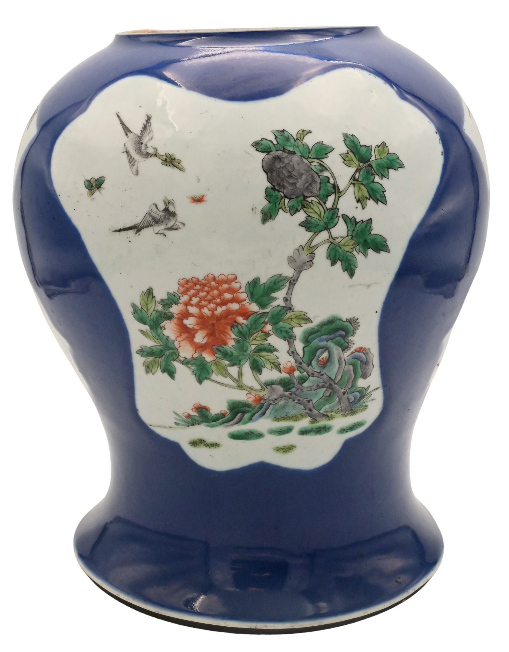 A porcelain jar, the body decorated with reserves of birds in flight amidst flowering branches and rockwork, painted in famille rose enamels, all against a rich cobalt blue ground. Raised on a flaring foot