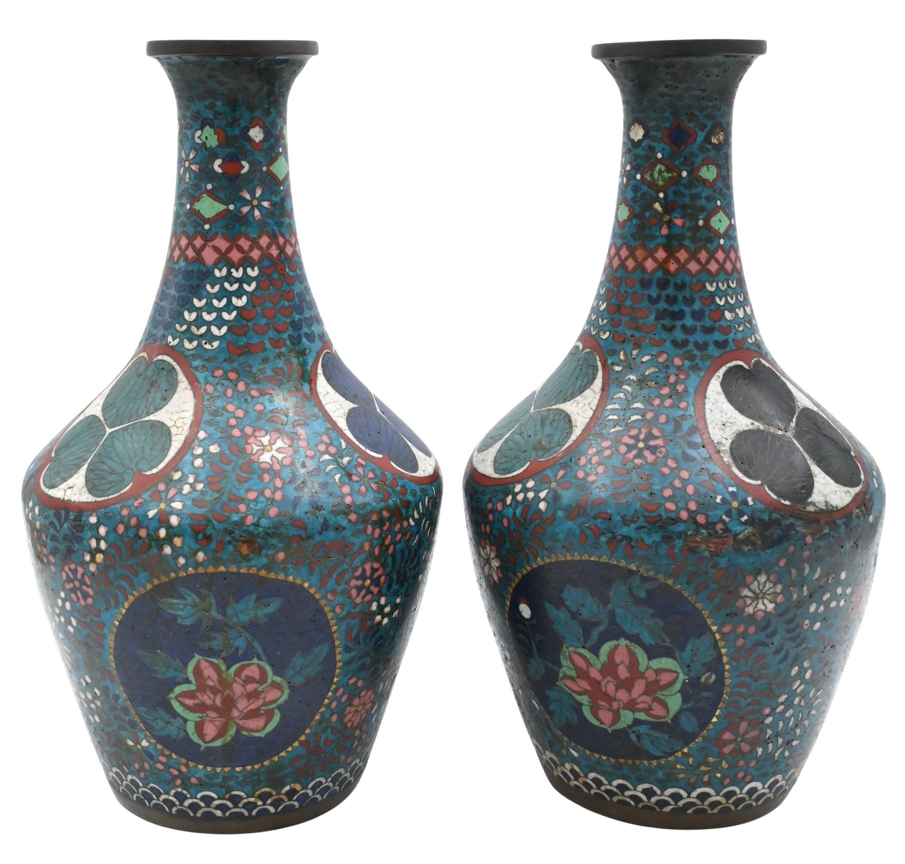 Each of hexagonal baluster form with flaring neck, decorated with scrolling polychrome enamels on a turquoise ground, the sides with quatrefoil cartouches enclosing stylized floral motifs.