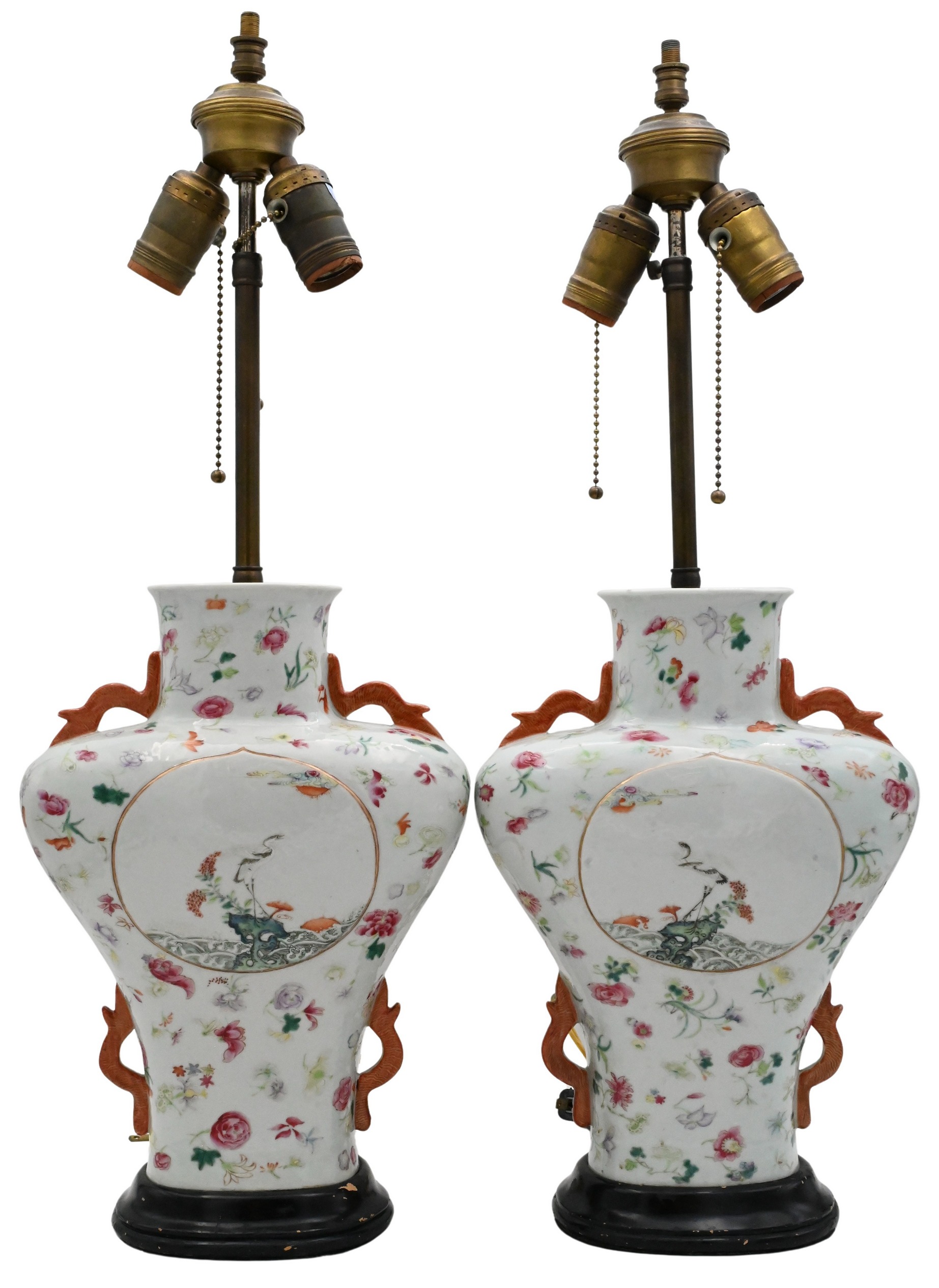 Pair of Chinese Famille Rose Compressed Baluster Vase / Lamps