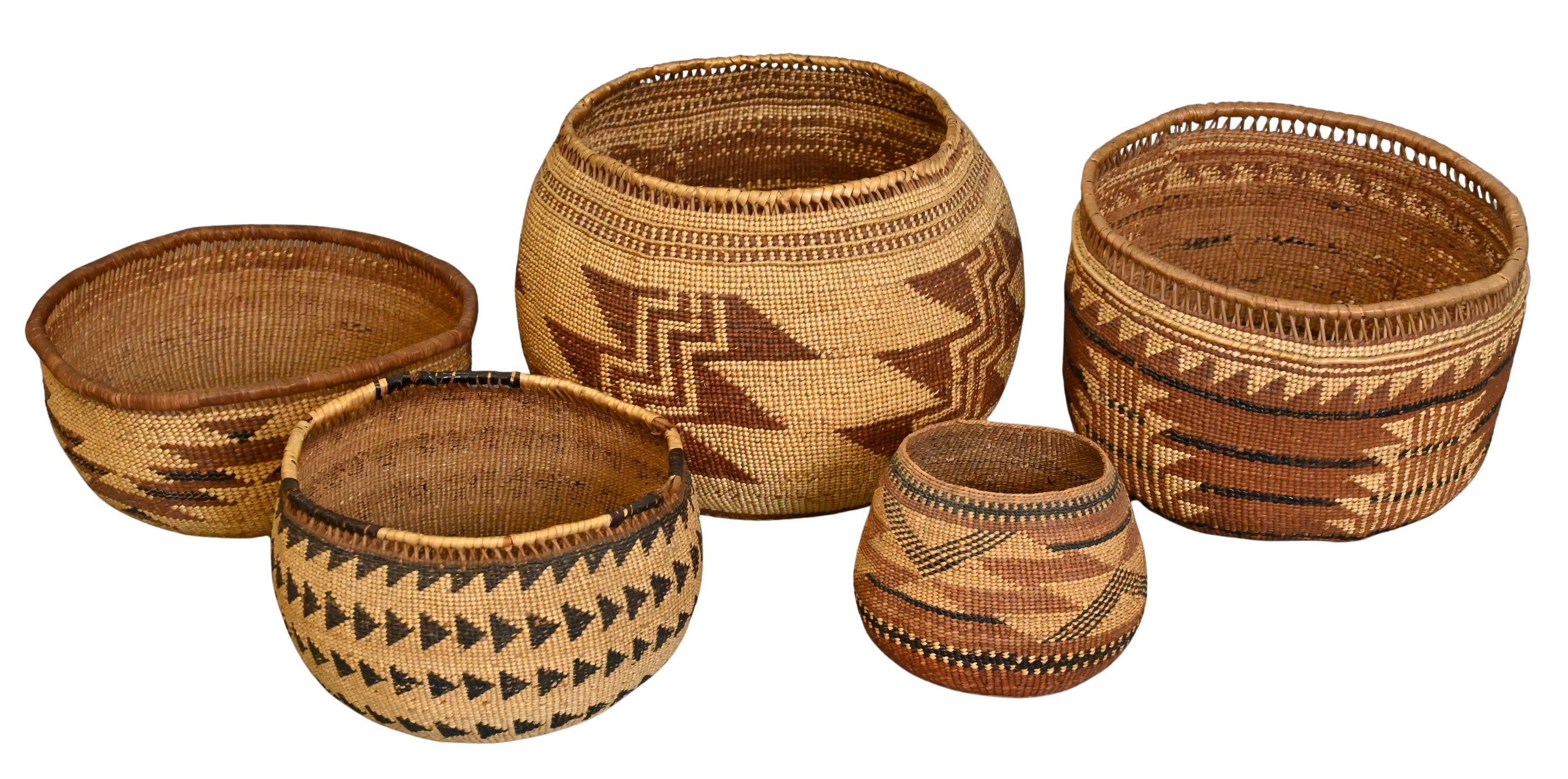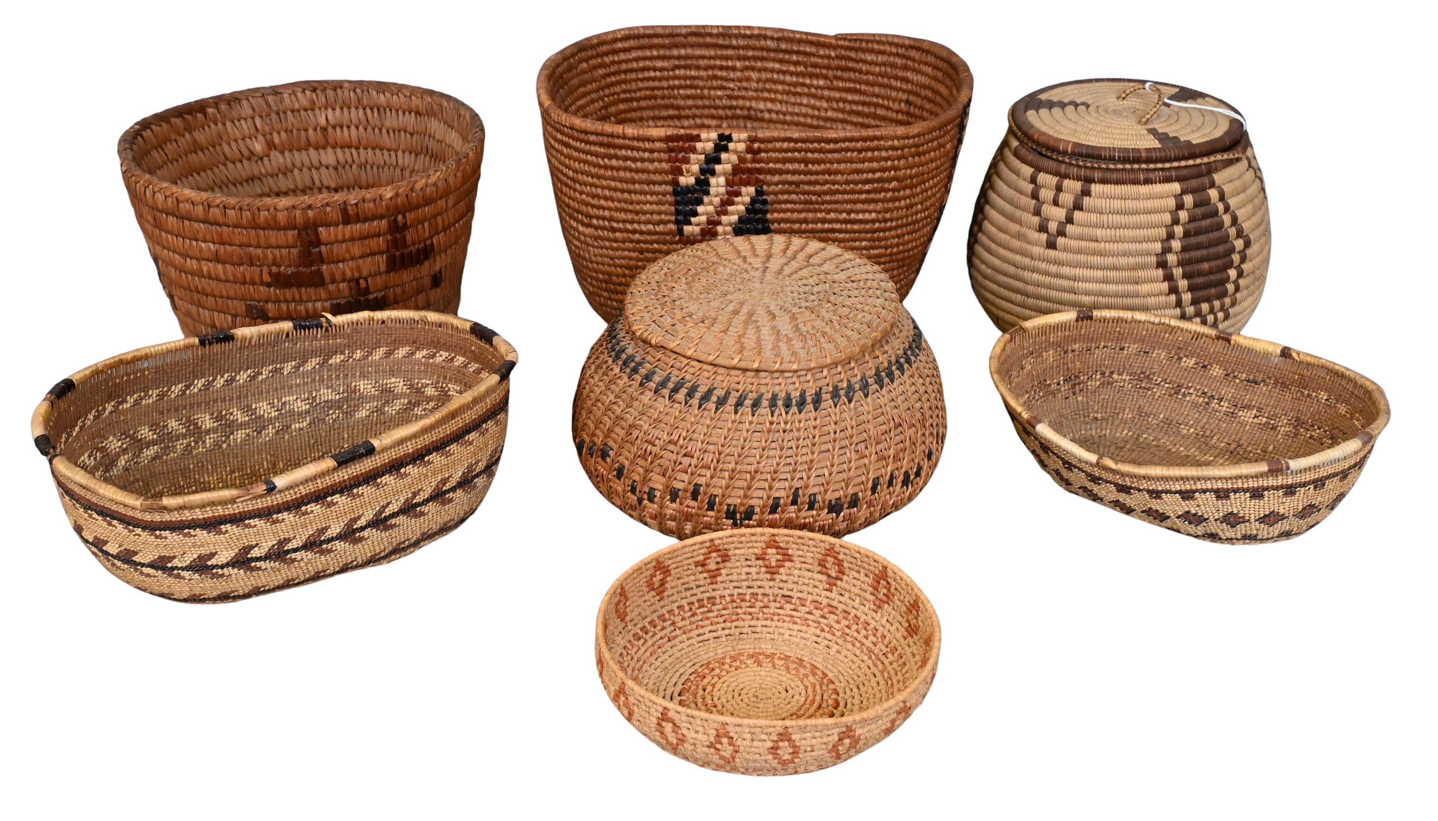 most likely from the Pacific Northwest Tlingit, one with red and brown bands, one with lid with beads on the inside
