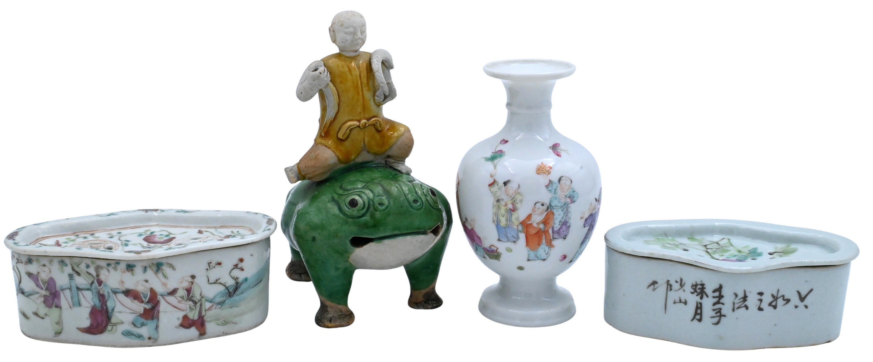 Including a figure of a boy riding a frog, a small famille rose vase probably Republic period decorated with figures and furniture, and two famille rose brush washers with pierced covers decorated with lotus.