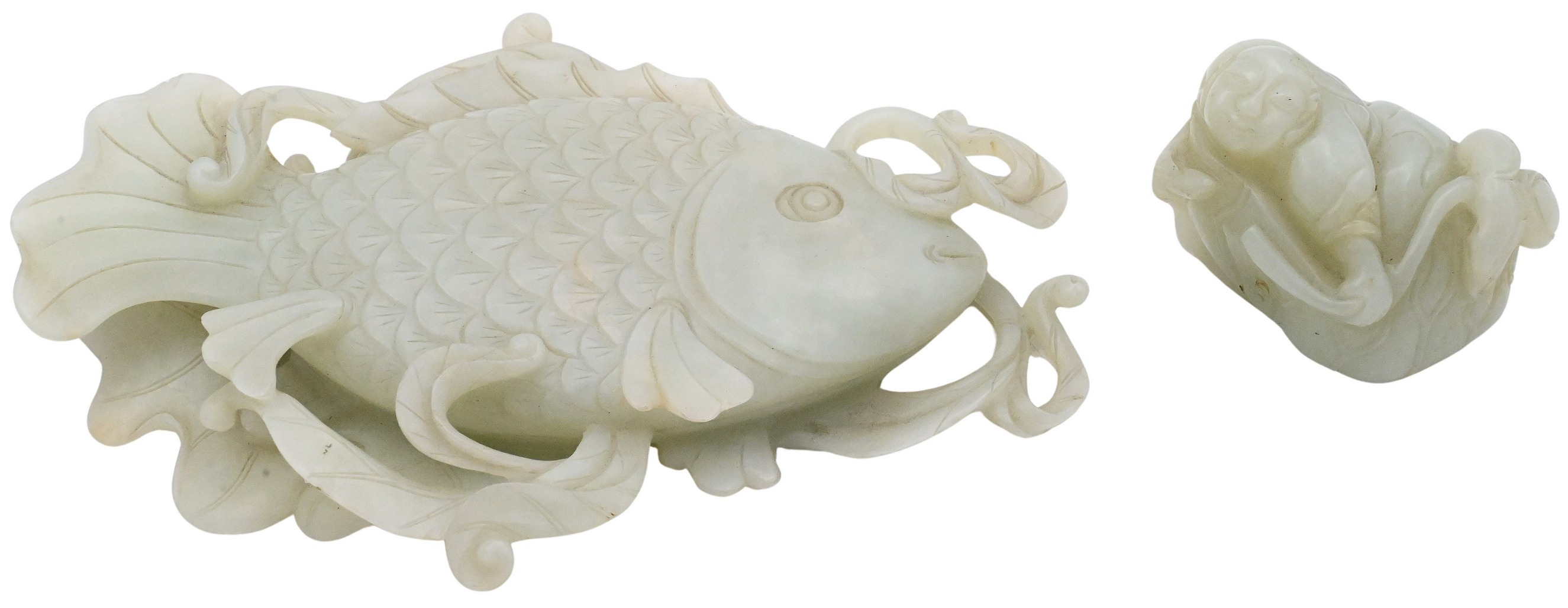 Well-carved in the form of a carp with finely detailed scales and flowing fins, the reverse recessed and hollowed to form a shallow lotus receptacle, possibly carved from pale celadon jade stone along with a white stone carving of a figure holding a gourd, Qing dynasty or later