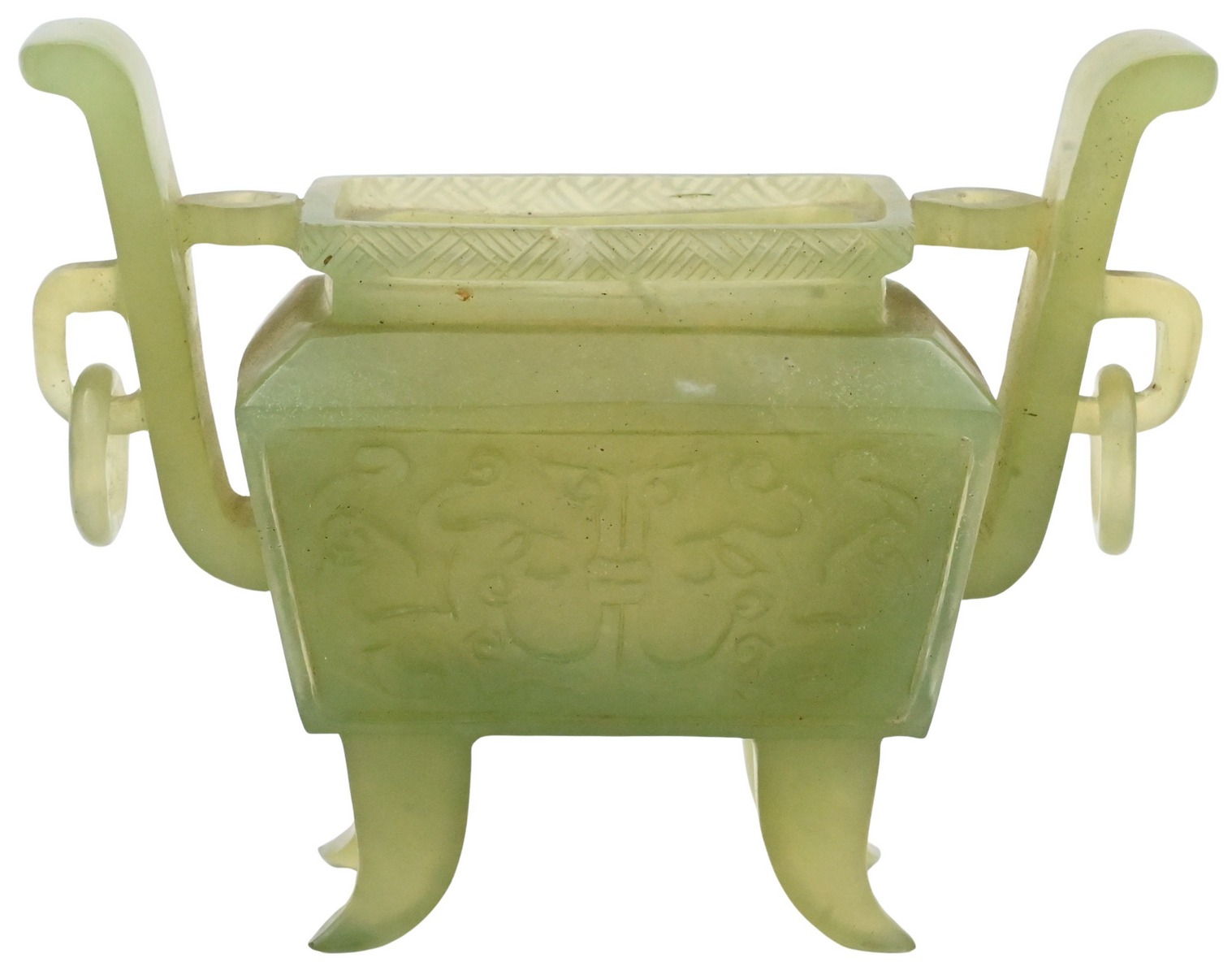 A small rectangular tripod censer in archaistic ding form, carved from mottled green jade. The body decorated in low relief with stylized motifs, flanked by upright loop handles, raised on four legs.