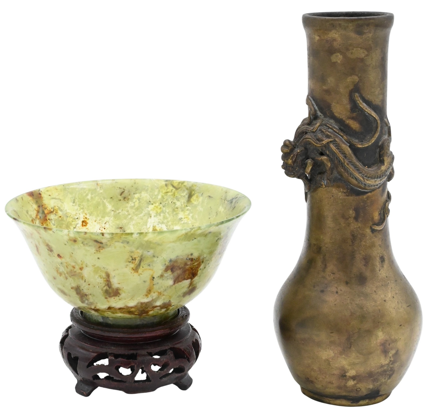 The bowl carved spinach jade, of flared form, raised on a carved wood stand; together with a small bronze vase of pear form, applied with a high-relief dragon to the neck