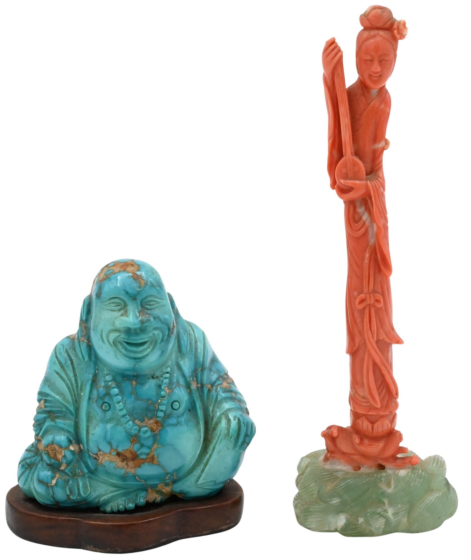 Chinese Carved Coral Guanyin Figure and Turquoise Buddha