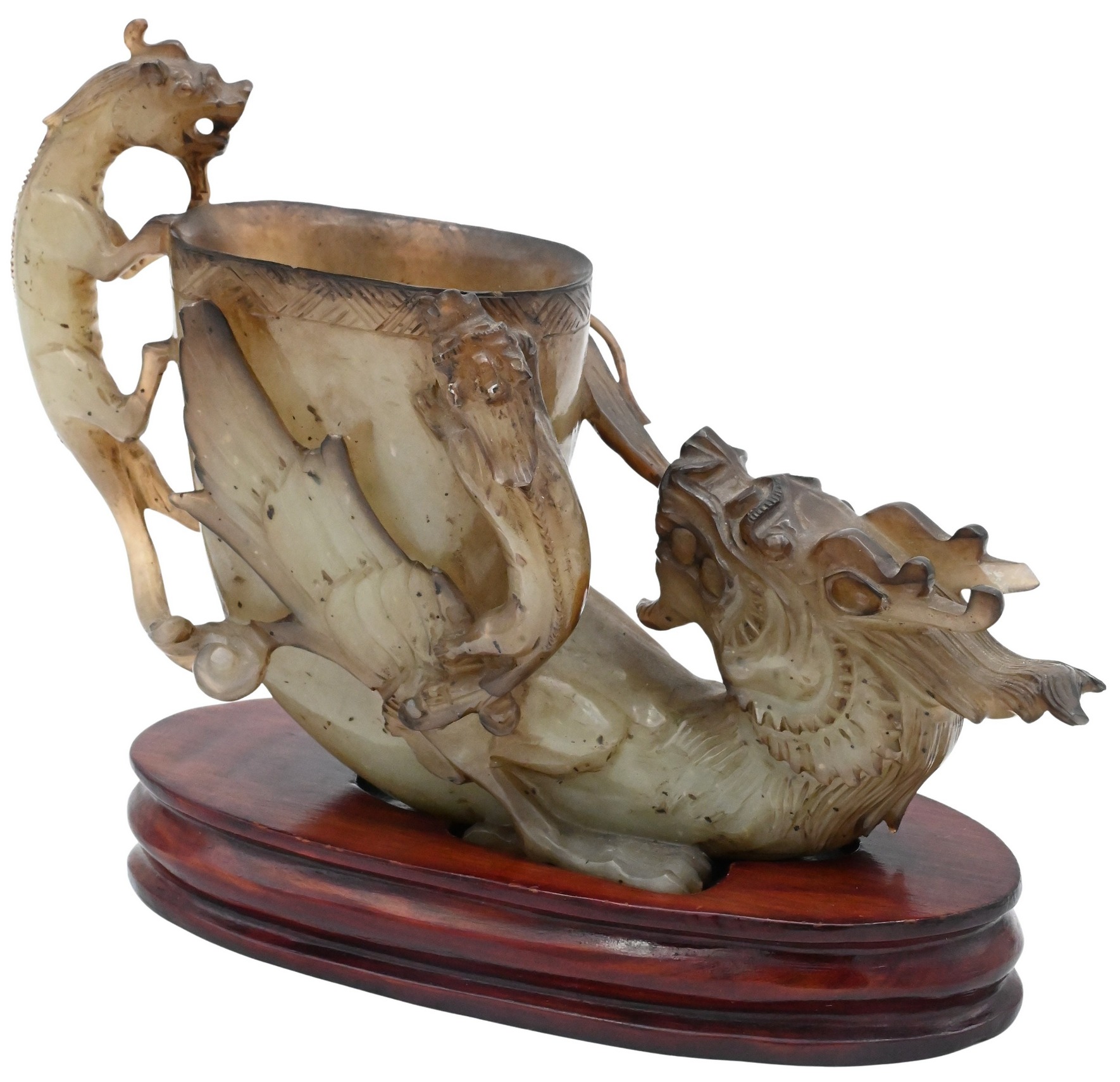 A Chinese carved jade libation cup of mottled brown and gray stone, the handle formed as a chilong dragon clambering up the side, with additional high-relief dragon and foliate carving around the body, recalling the form of ancient archaic bronze libation cups.
