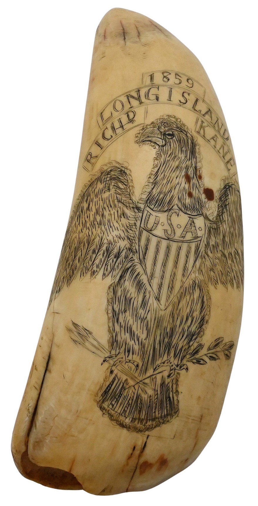 A finely engraved scrimshaw whale’s tooth depicting a spread-winged American eagle with shield marked “U.S.A.,” clutching arrows and an olive branch. Above inscribed “1859 / LONG ISLAND / RICHD KANE.” Warm age patina throughout.
