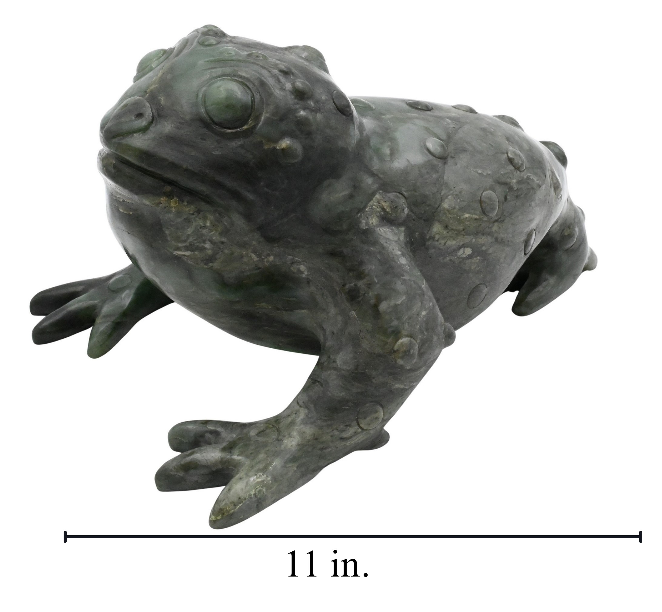 A substantial carving of the auspicious three-legged frog (Jin Chan or Chan Chu) symbol of prosperity and wealth, rendered in dark green hardstone, possibly nephrite or serpentine. Well detailed with textured skin and crouching pose.