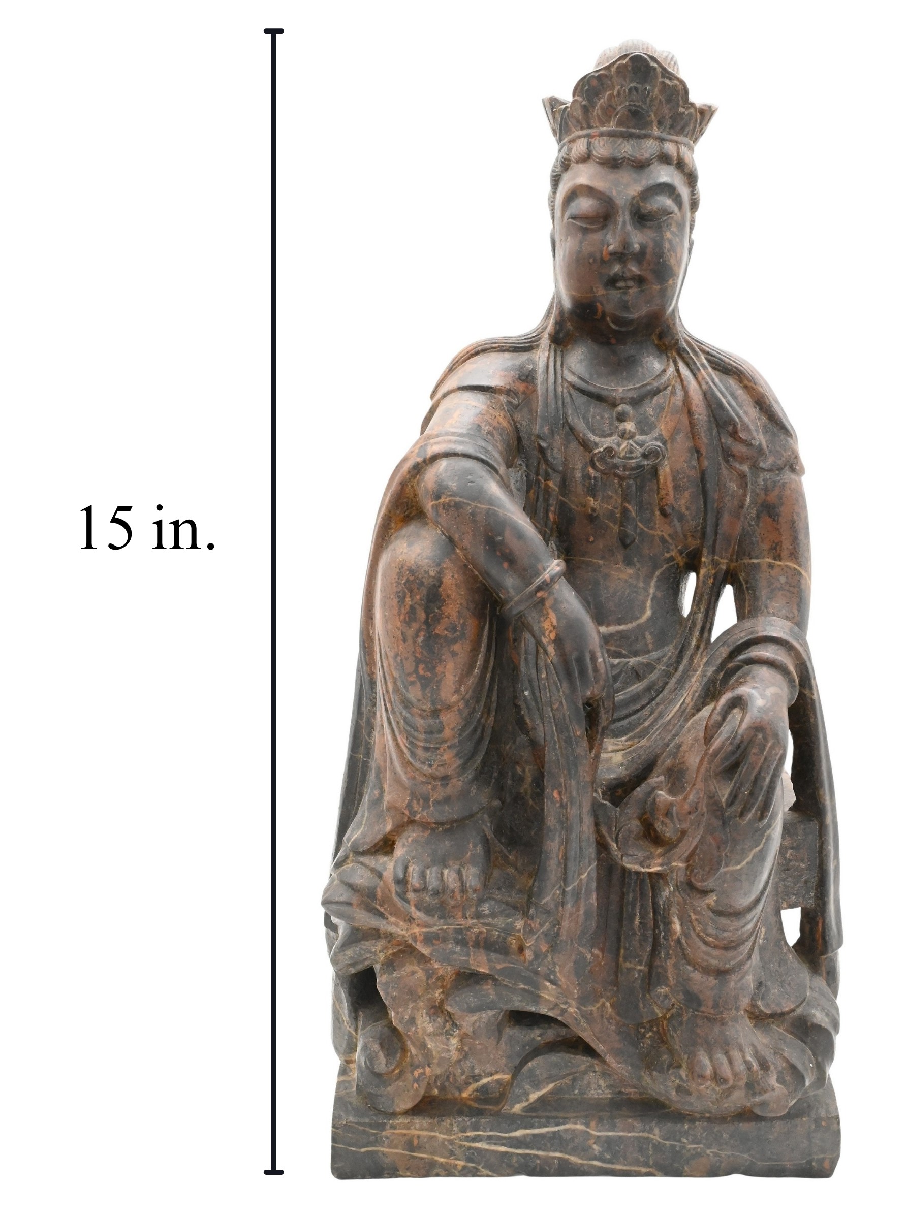 Chinese stone-carved figure of Guanyin, depicted seated in royal ease with one arm resting on a raised knee. The deity wears a flowing robe and ornate crown, with traces of surface pigment and age patina throughout.