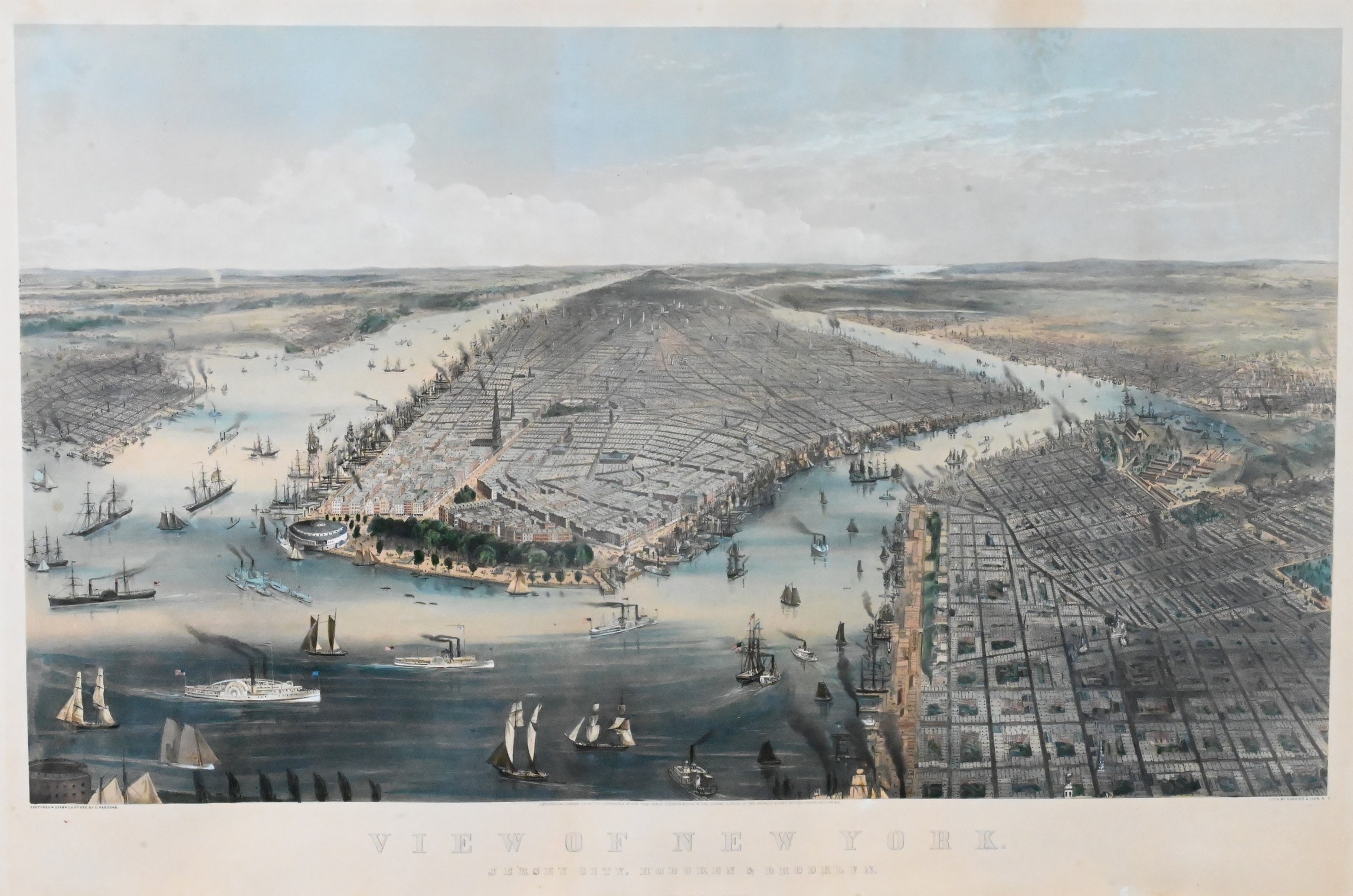 Large folio city view showing Manhattan from the south, with the Battery in the foreground, the Hudson and East Rivers filled with sailing vessels and steamships, and Jersey City, Hoboken, and Brooklyn beyond. One of the firm’s most iconic 19th-century panoramas of New York, combining topographical accuracy with a celebratory vision of the city.