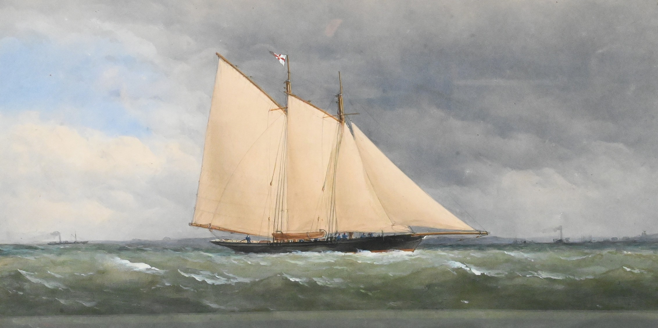 Depicting a schooner navigating through rough seas beneath a stormy sky, painted with atmospheric detail and fine rigging.