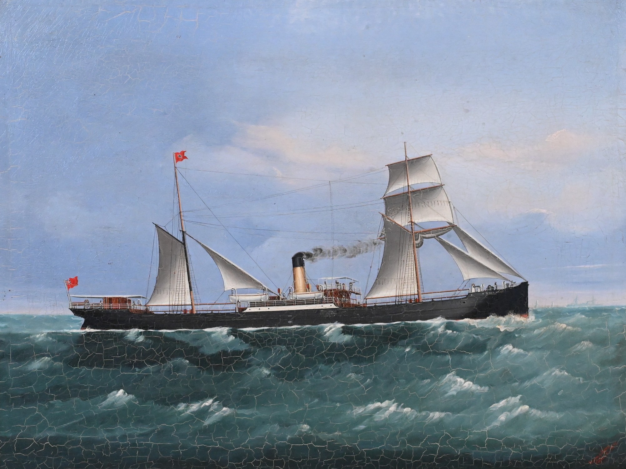 Depicting a steamship with auxiliary sails set on a choppy green sea under a blue sky, flying red pennant and ensign. Painted in the precise style characteristic of Canton port painters who supplied ship captains and Western traders with commemorative portraits of their vessels
