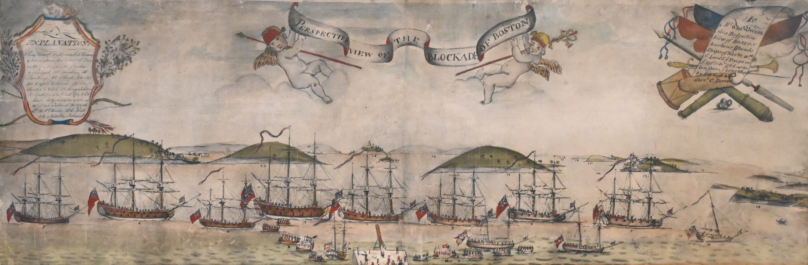 Panoramic composition of the British naval blockade of Boston Harbor, featuring numerous warships, transports, and harbor islands, with an “Explanation” cartouche at left identifying key sites including Long Wharf, Castle William, Governor’s Island, and Nantasket. At right, a dedicatory cartouche notes: “To Mr. Thos. Vernon this Perspective View of Boston Harbour, Islands, Ships of War &c, with the Land Troops in ye last Octo. 1768…”, and the work is inscribed within the design, “by his most obt. servt. C. Remick.”