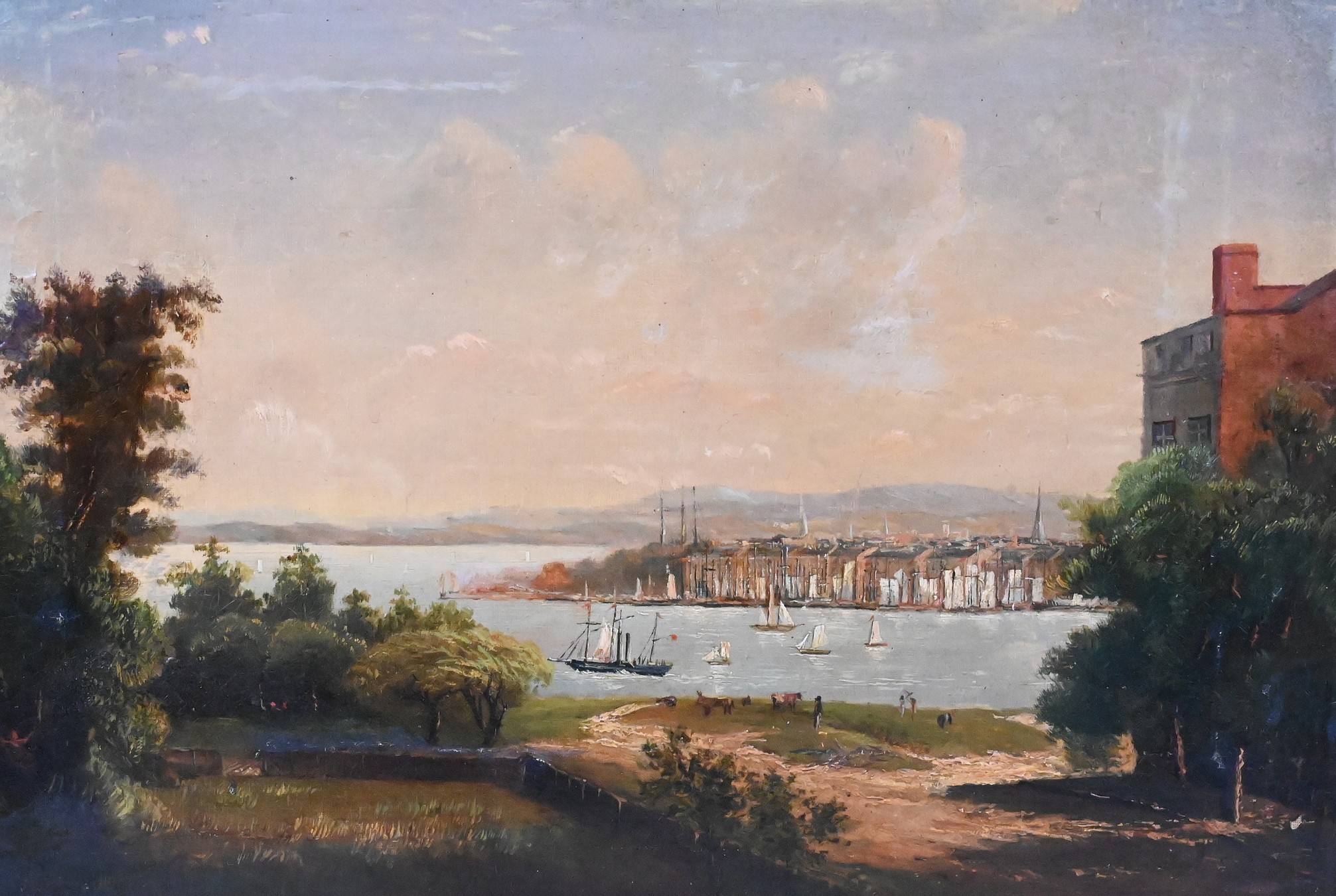 A finely painted view of lower Manhattan as seen from Brooklyn Heights, depicting sailboats and early shipping activity along the East River with the New York skyline in the distance.