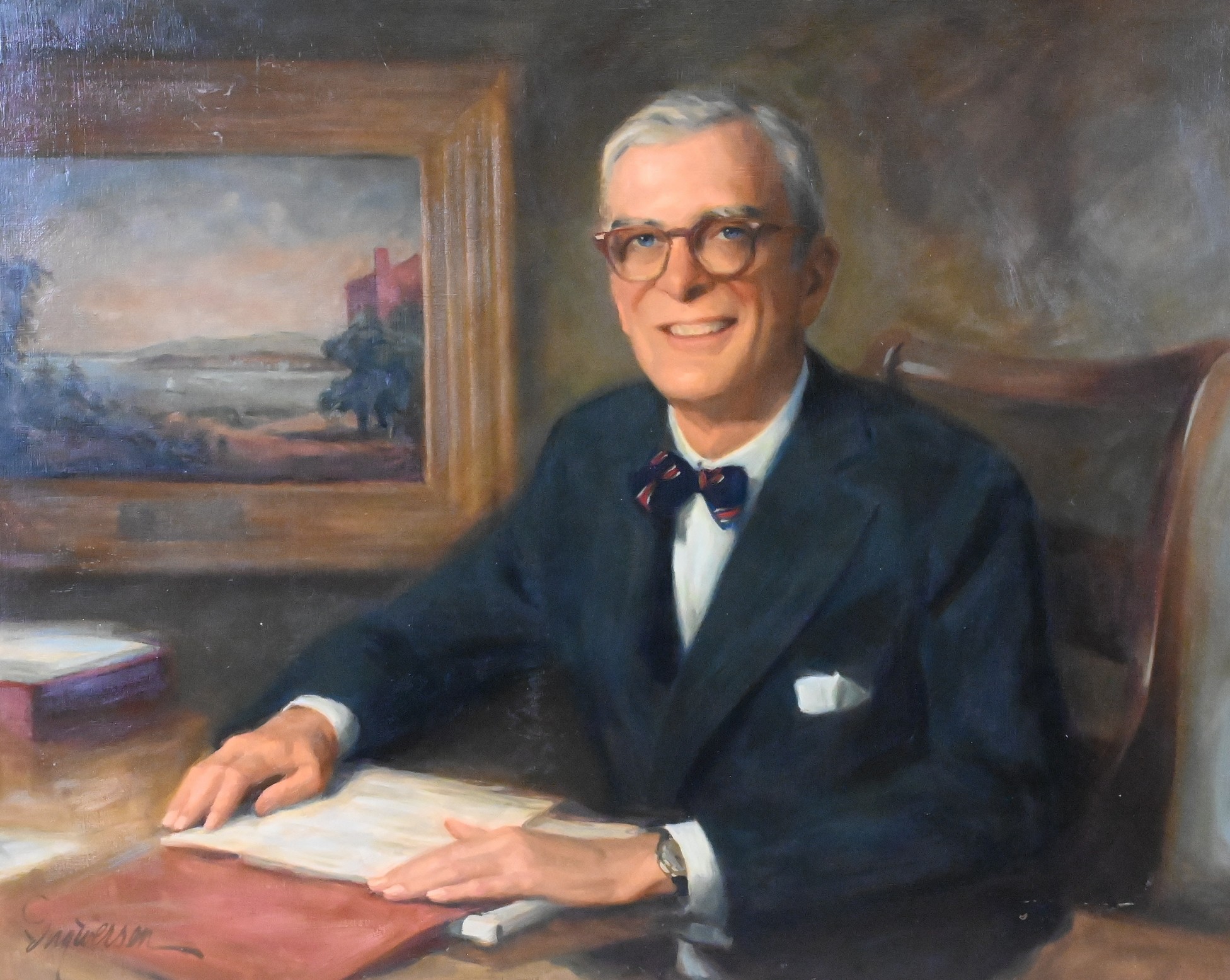 A formal three-quarter length portrait of Percy Chubb II, seated at a desk with an open book and red folders, wearing a dark suit, bow tie, and glasses, with a framed landscape painting of “View of Lower New York from Brooklyn Heights” in the background.