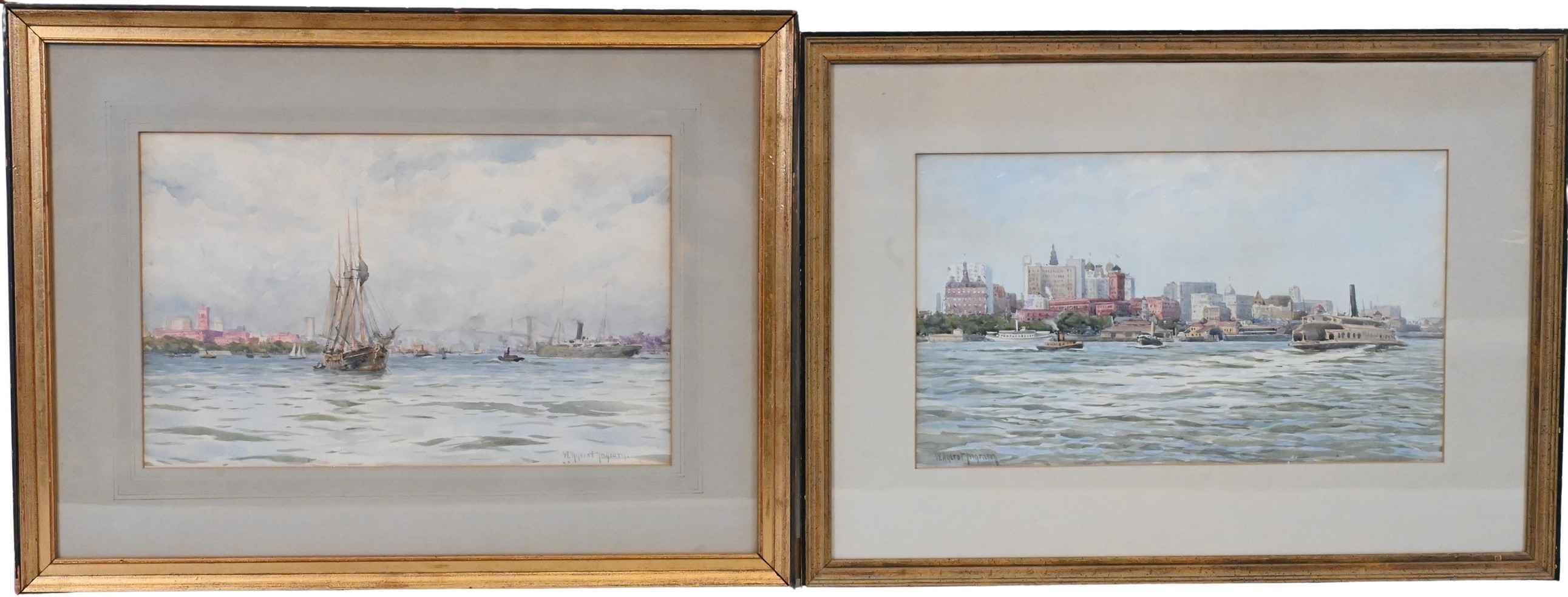 both depicting bustling views of New York Harbor: one with ferries crossing in front of the skyline, the other with a three-masted schooner and steamships against a cloud-filled sky