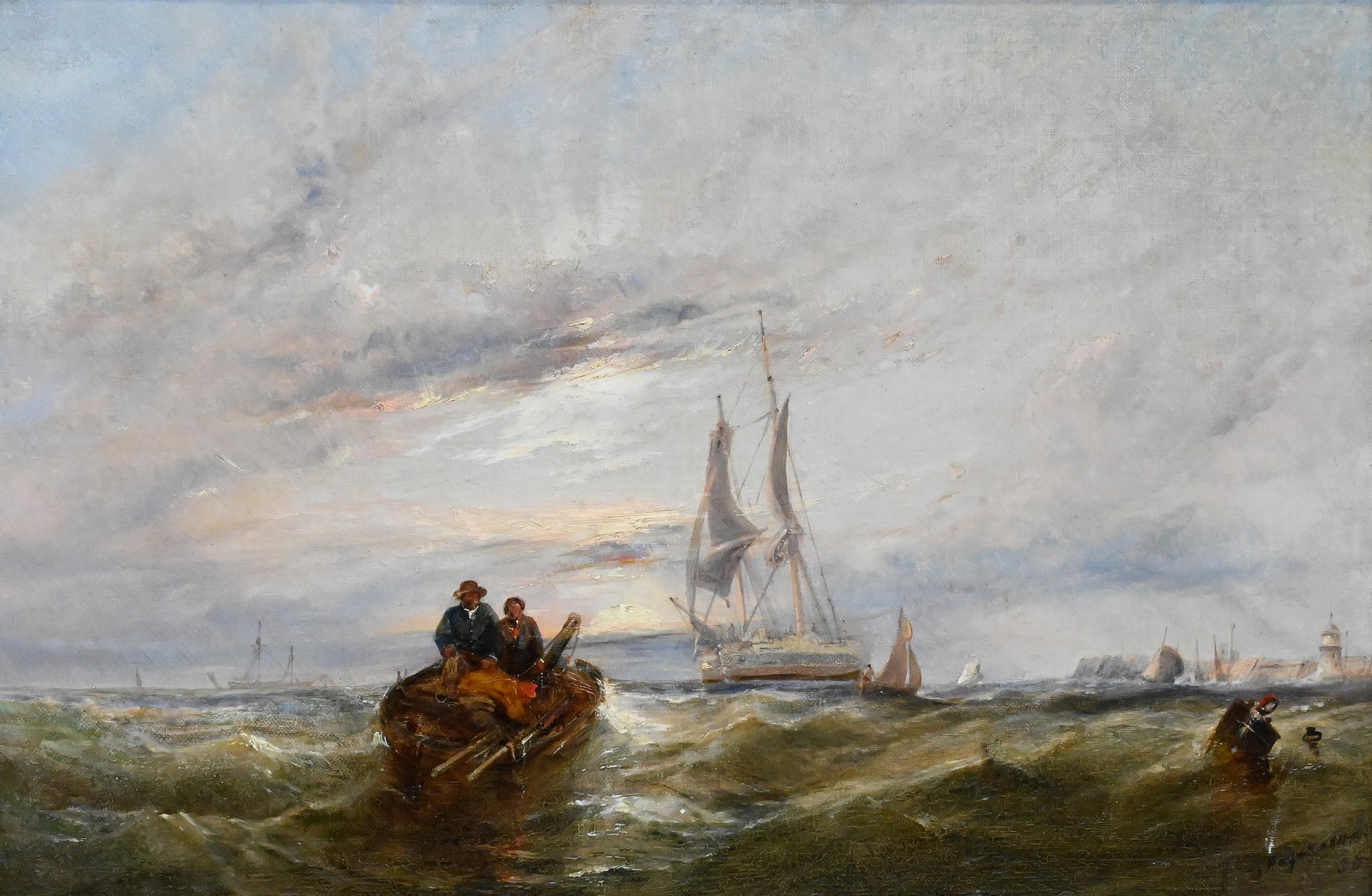 Depicting fishermen rowing in a small craft amid turbulent waters, with larger sailing vessels beyond beneath a dramatic cloudy sky