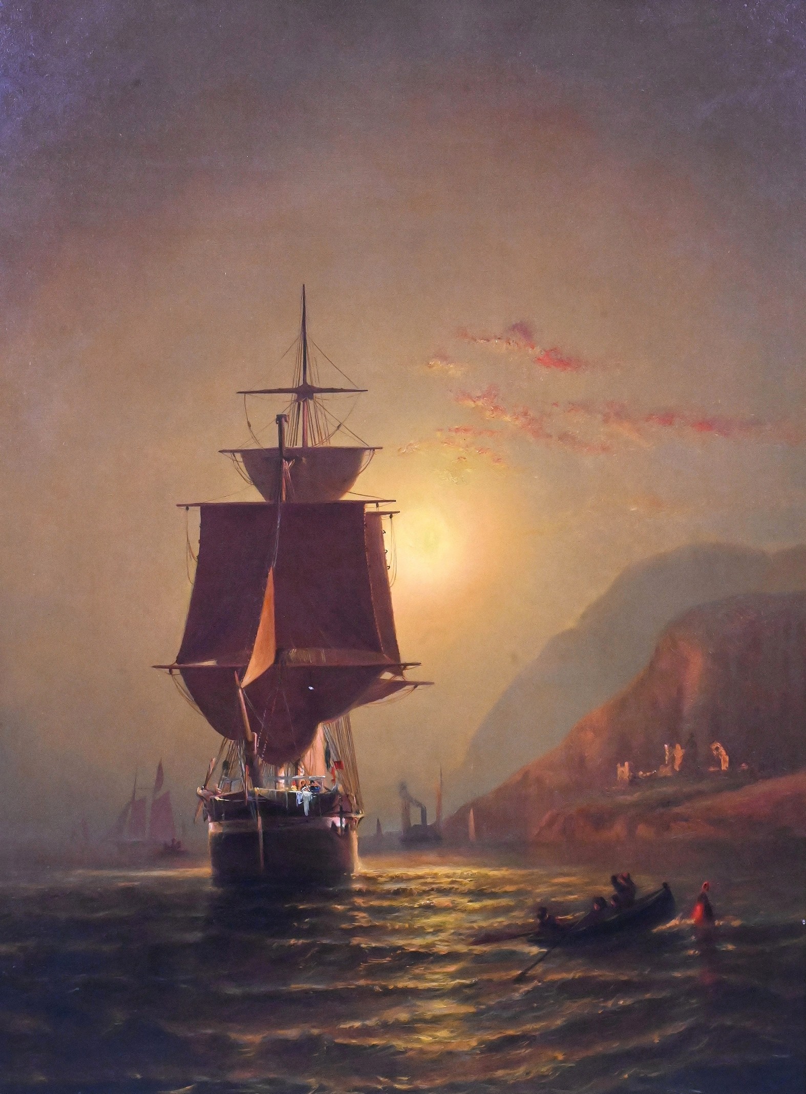 depicting a large sailing vessel with red-brown sails catching the evening light as it approaches shore, smaller boats in the foreground and figures gathered along the rocky coastline, all under a dramatic golden sky.