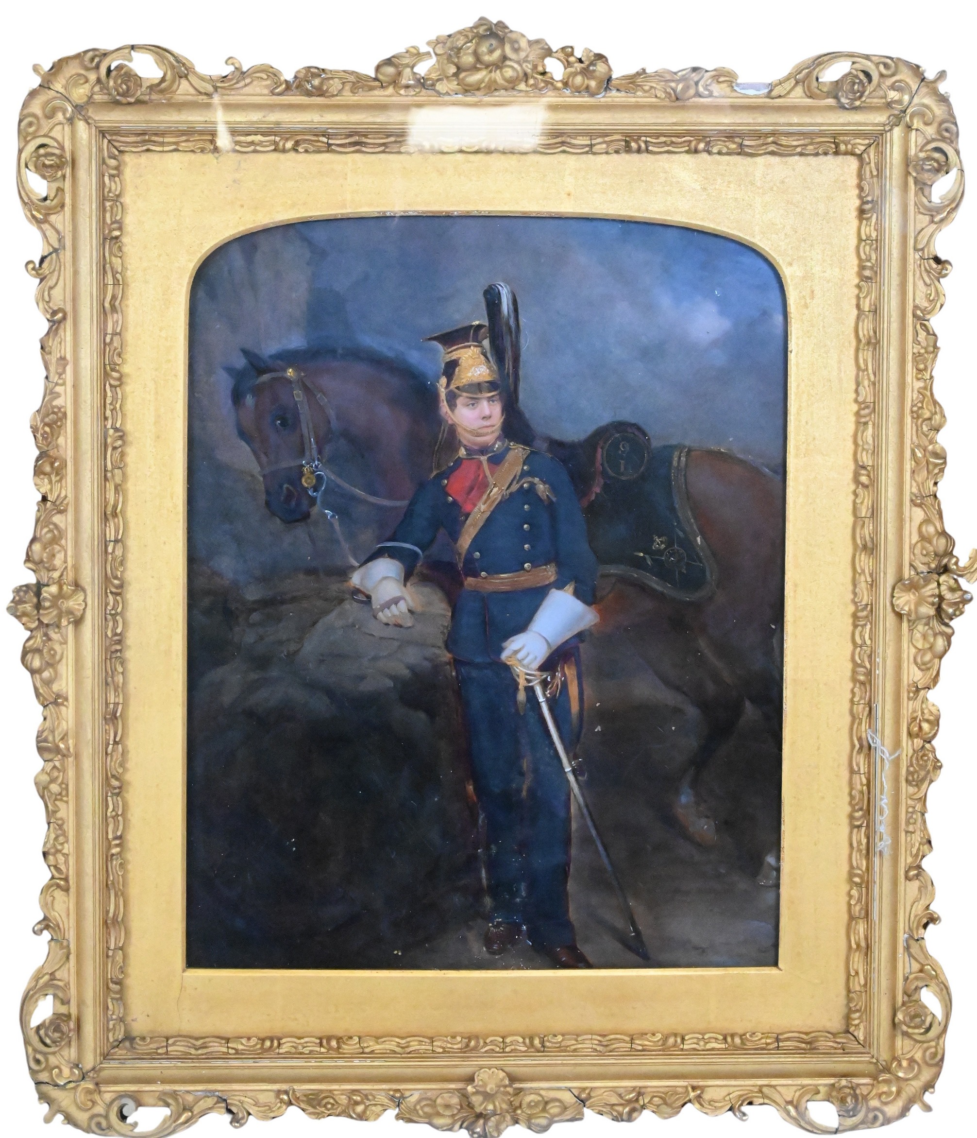 Depicting officer standing beside his horse, wearing a gilt crested helmet with plume, dark blue coat with red facings, sash, and sword. The horse’s saddle cloth is embroidered with the numeral “9”, similar to artists such as Theodore Gericault (French 1791-1824) Emile Jean Horace Vernet (French 1789-1863)