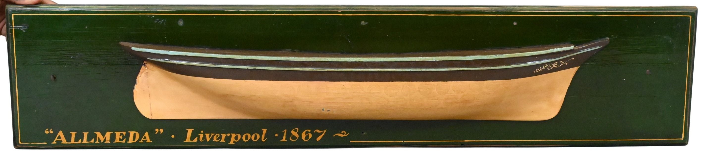 signed “Alameda” Liverpool, 1867 possibly in reference to the ship Alameda, The hull in varnished hardwood with molded sheer and carved stem, presented as a company display or executive piece.