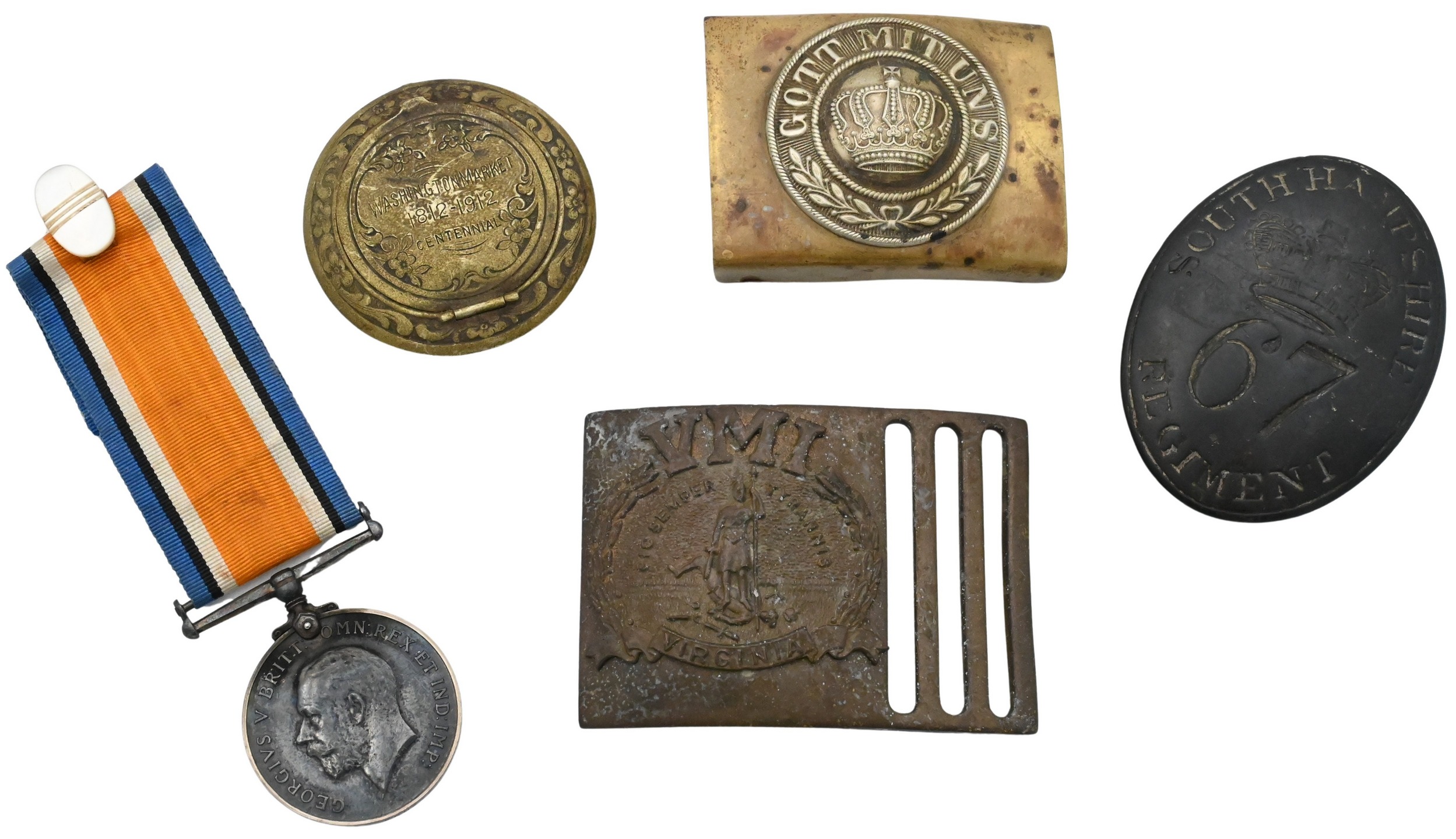 Including a German “Gott Mit Uns” brass belt buckle, a South Hampshire Regiment belt buckle, additional British belt plates and buttons, a George V service medal, and related commemorative items