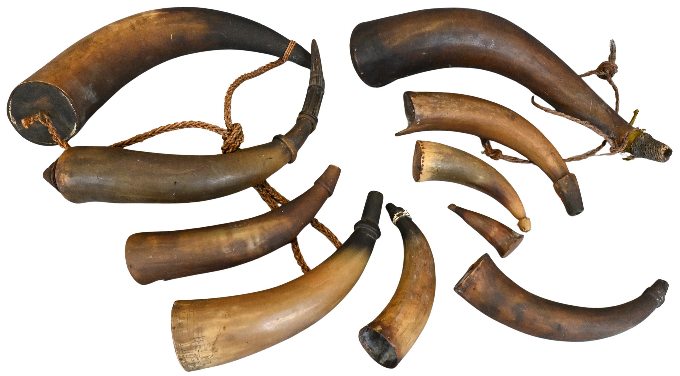 A collection of powder horns in assorted sizes, including one scrimshawed with a landscape depicting a house, picket fence, and a man shooting a bird. Some retain wooden plugs, and one retains a braided cord.