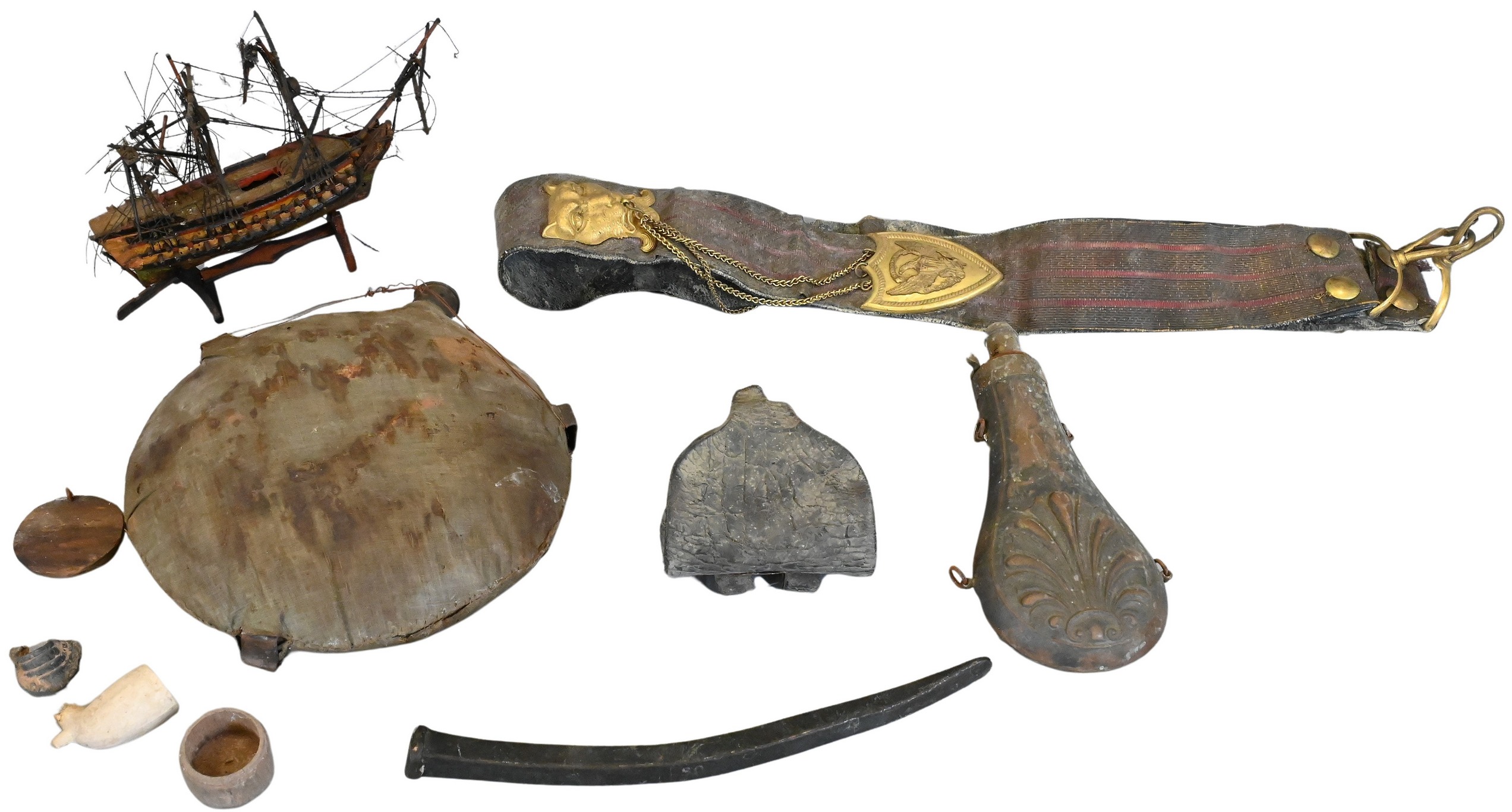 Including a military belt with brass lion mask clasp and eagle medallion, a decorated powder flask, two wooden canteens, and an early metal canteen with cloth covering, together with a clay pipe bowl fragment and assorted militaria and relics