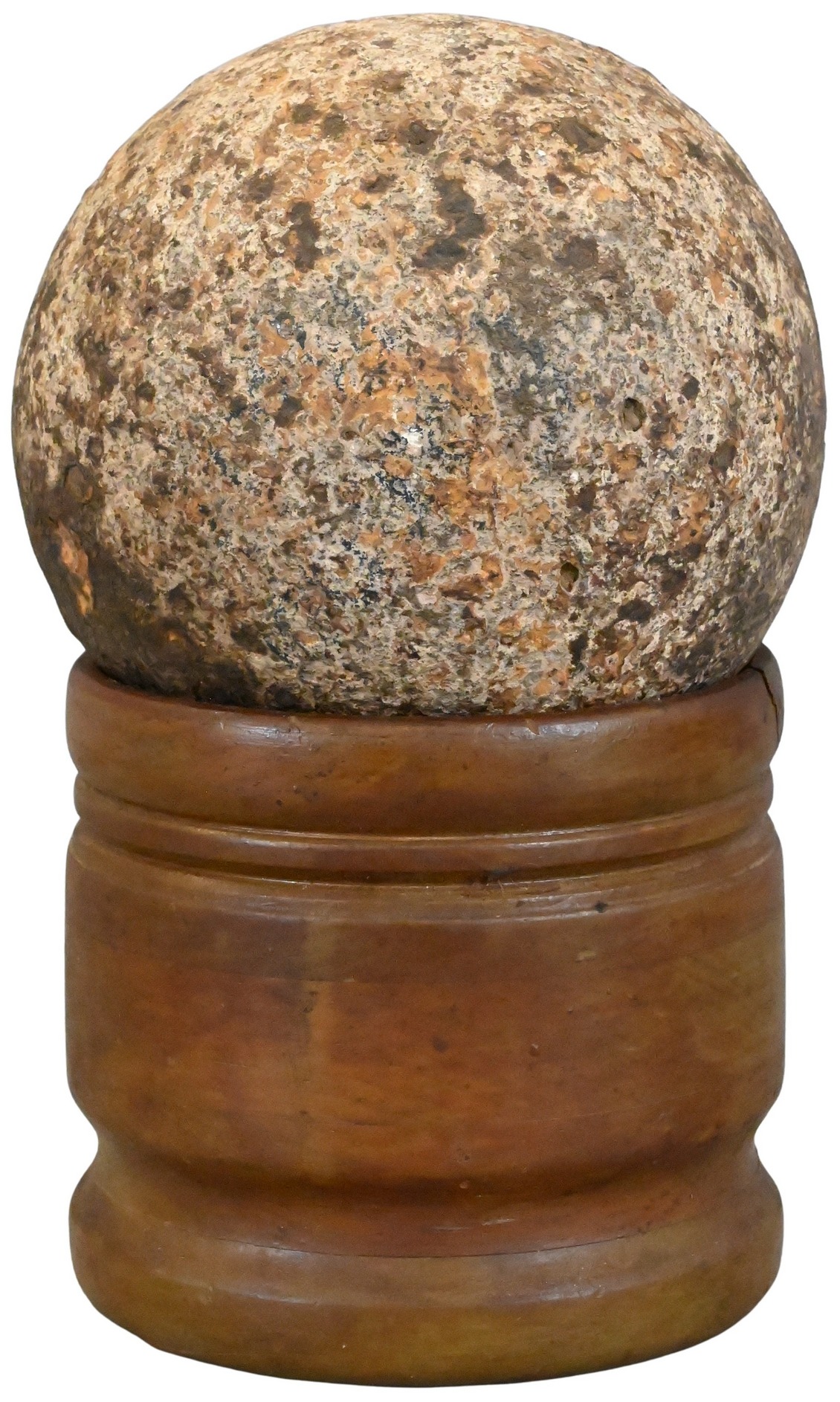 A solid iron cannonball with pitted surface from age and exposure, displayed on a turned wooden stand.