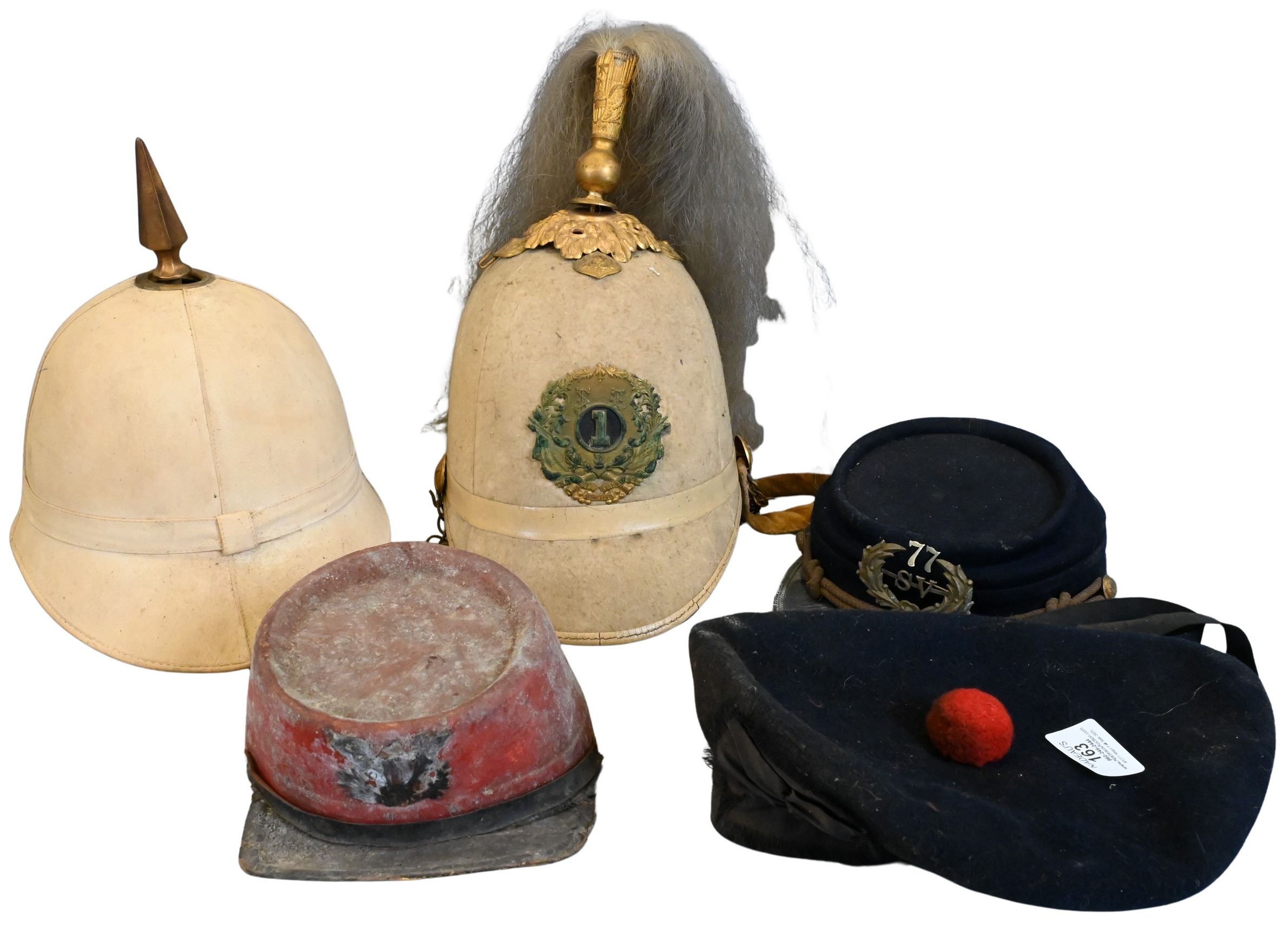 Including a white parade helmet with gilt mount and horsehair plume, a white sun helmet with spike finial, a Kepi with insignia “77,” a dark wool shako-style cap with red pompom, and an additional red cap