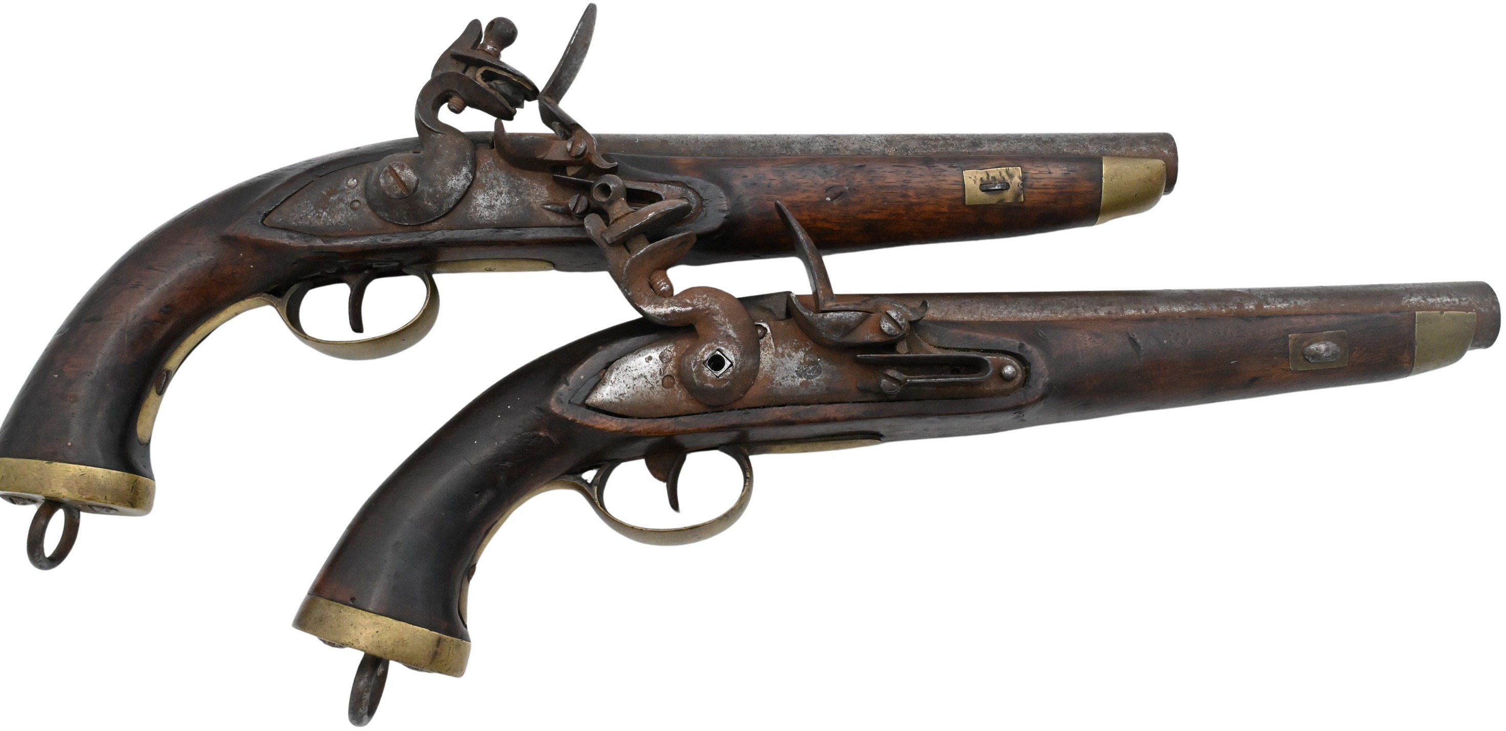 Assorted group of four flintlock pistols, including examples with walnut stocks, brass mounts, and engraved lock plates. Various sizes and forms.