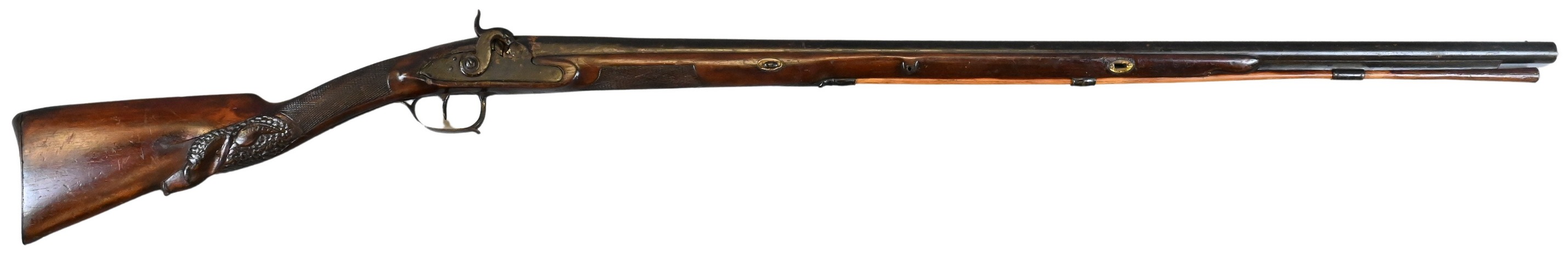 A percussion long gun with checkered walnut stock, the grip carved in relief with an animal’s head, possibly a boar with pronounced tusks. Fitted with iron mounts and percussion lock.