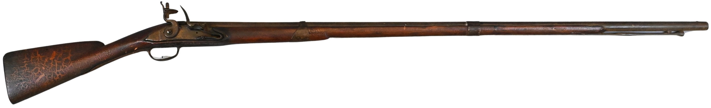 A flintlock long gun with full-length wooden stock and iron barrel, fitted with steel lock plate and trigger guard.