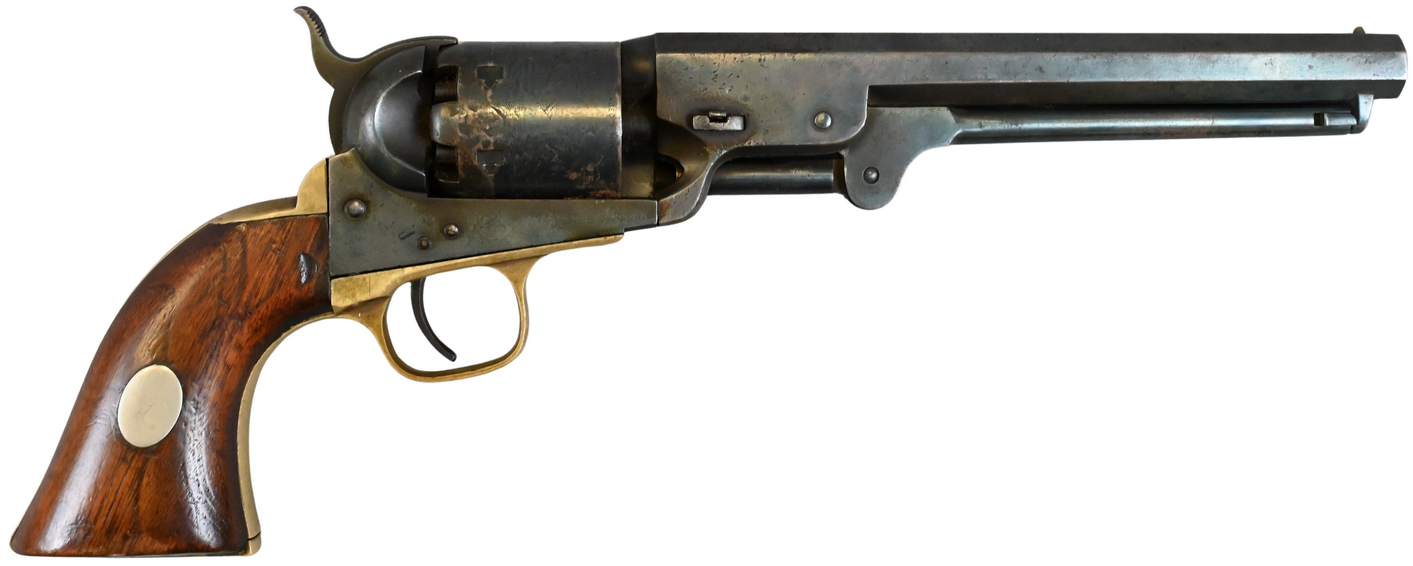 with naval engagement on cylinder and octagonal barrel, serial number 113799 (manufactured in 1861) on strap, barrel, and frame, non matching cylinder serial number 57074 wooden grips inlaid with dog on one side and oval cartouche on the other, back strap engraved “Presented to Captain G.W. Stackhouse/ By his company Rest N.Y.S.V.”, cylinder engraved with sailing ships