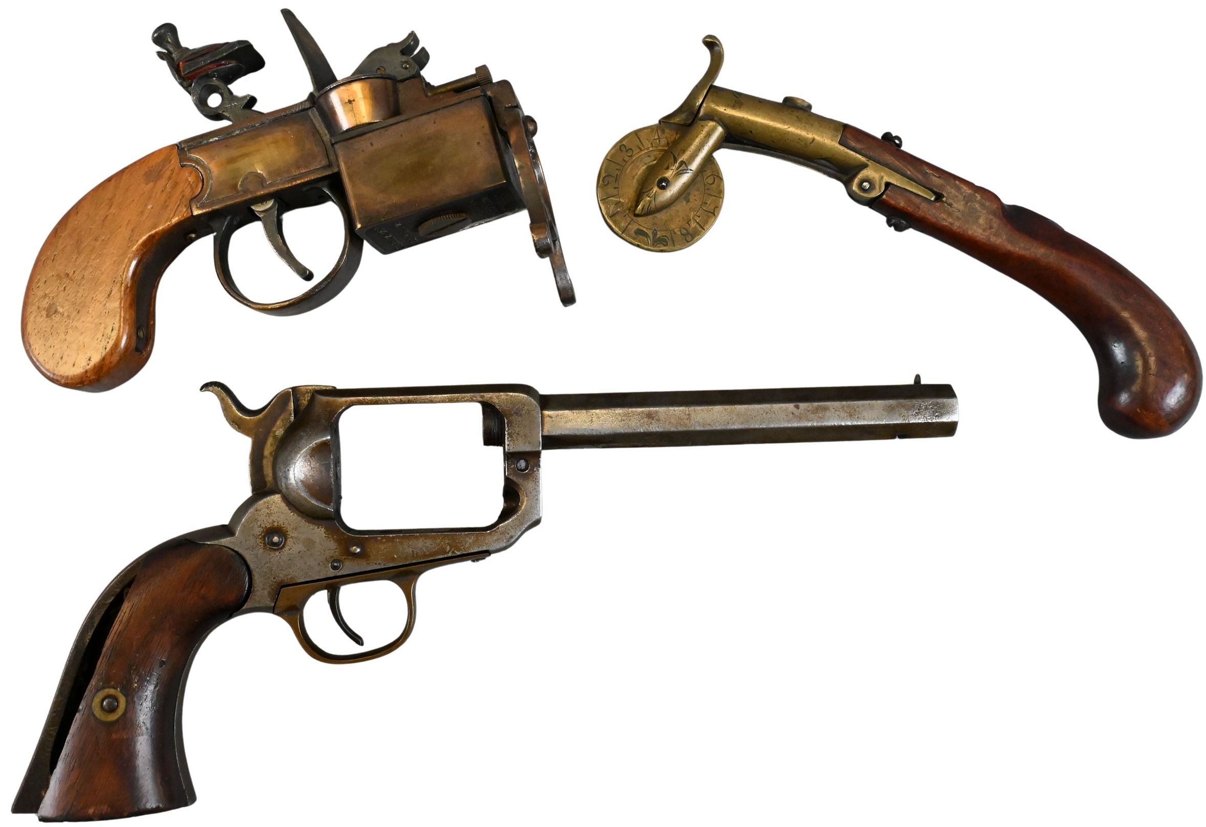 Including a flintlock tinder pistol, a brass and wood powder tester, and a small-frame revolver lacking its cylinder.