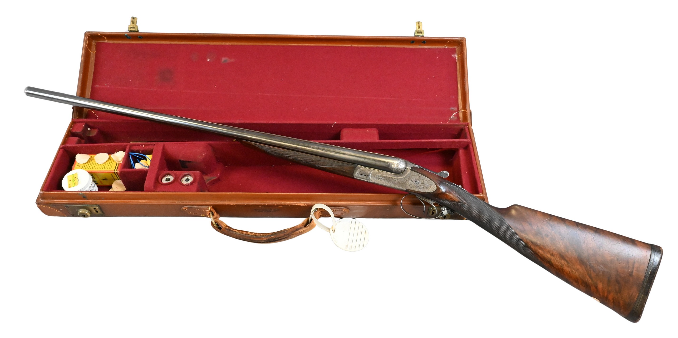 having checkered English stock, double trigger and highly engraved scrollwork, serial number 4271 with leather case, barrel length 28 inches, pull length 14 1/2 inches