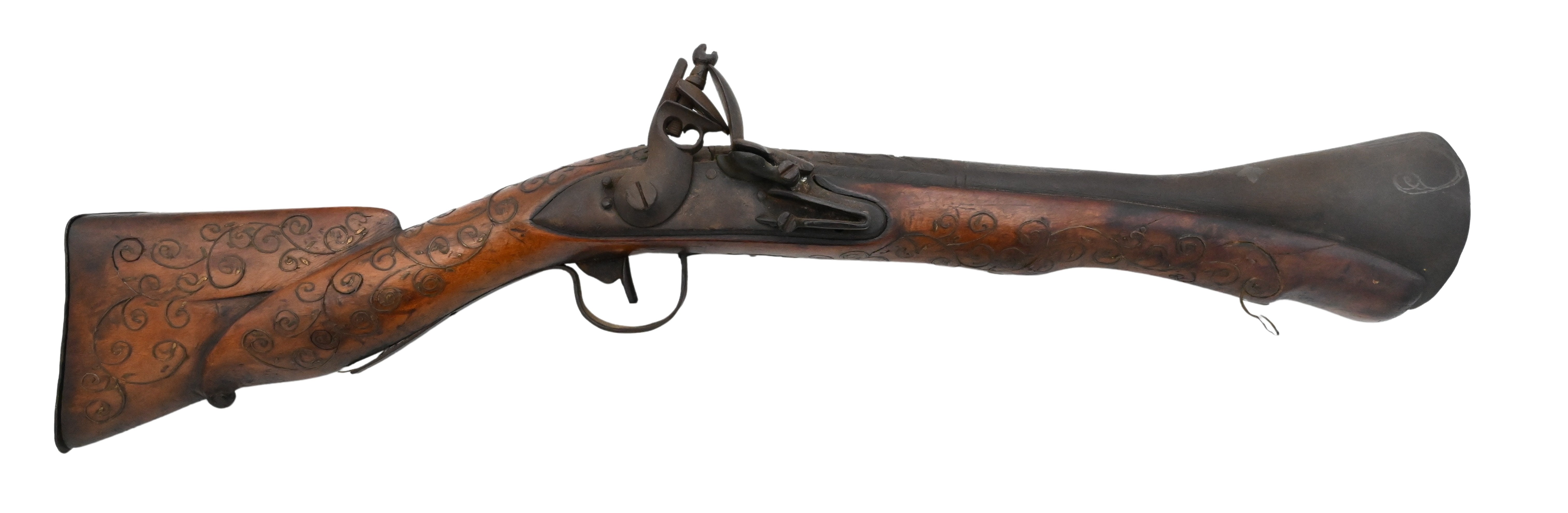 The walnut stock extensively decorated with brass inlay throughout the butt and forestock, the barrel with decorative motifs to the top flat, iron lock and trigger guard, and flaring muzzle. A well-made and attractively embellished example retaining dark patina and period character.